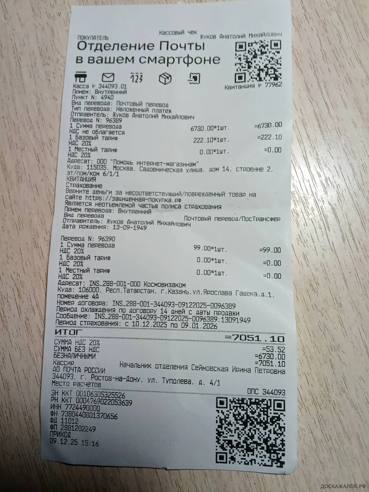 В декабре я заказал на сайте, распродажа-черная пятница. Зеркало видеорегистратор с радар-детектором Fugicar за 2390р. Девушка оператор предложила мне новую версию видеорегистратора с радаром + карту памяти на 64Гб + очки для водителя, за все 6700р. Я согласился. Прислали видеорегистратор Vehickie Blackbox DVR, без радар-детектора и карта памяти на 16Гб. Прошу вернуть мне деньги. Товар могу выслать. Лежит в коробке, я им не пользуюсь. Прилагаю чек оплаты.
