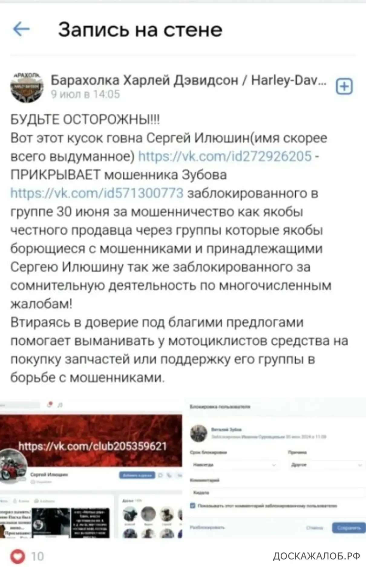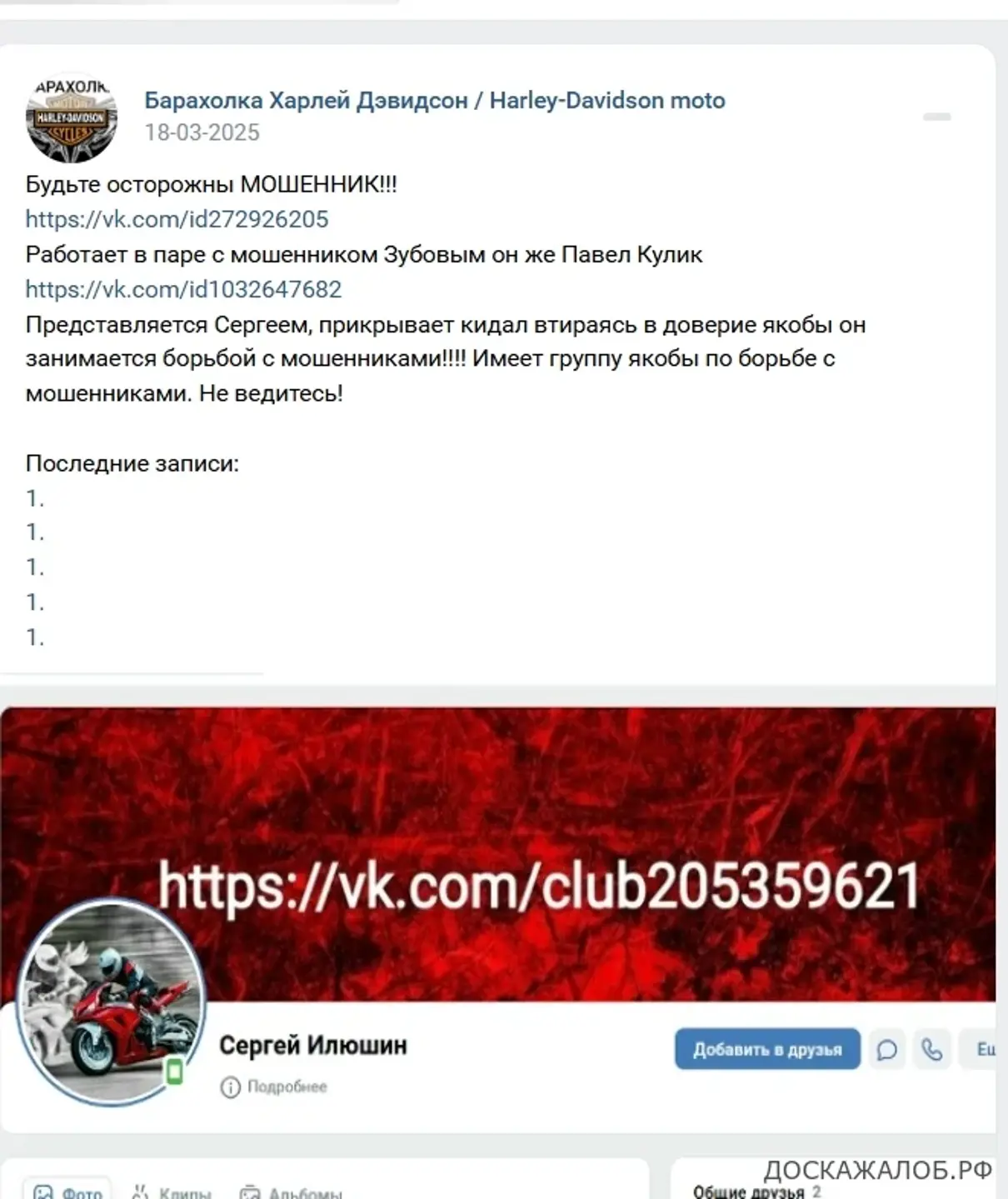 Вот этот кусок говна Сергей Илюшин (имя скорее всего выдуманное) https://vk.com/id272926205 - ПРИКРЫВАЕТ мошенника Зубова https://vk.com/id571300773 заблокированного в группе 30 июня за мошенничество как якобы честного продавца через группы которые якобы борющиеся с мошенниками и принадлежащими Сергею Илюшину так же заблокированного за сомнительную деятельность по многочисленным жалобам!