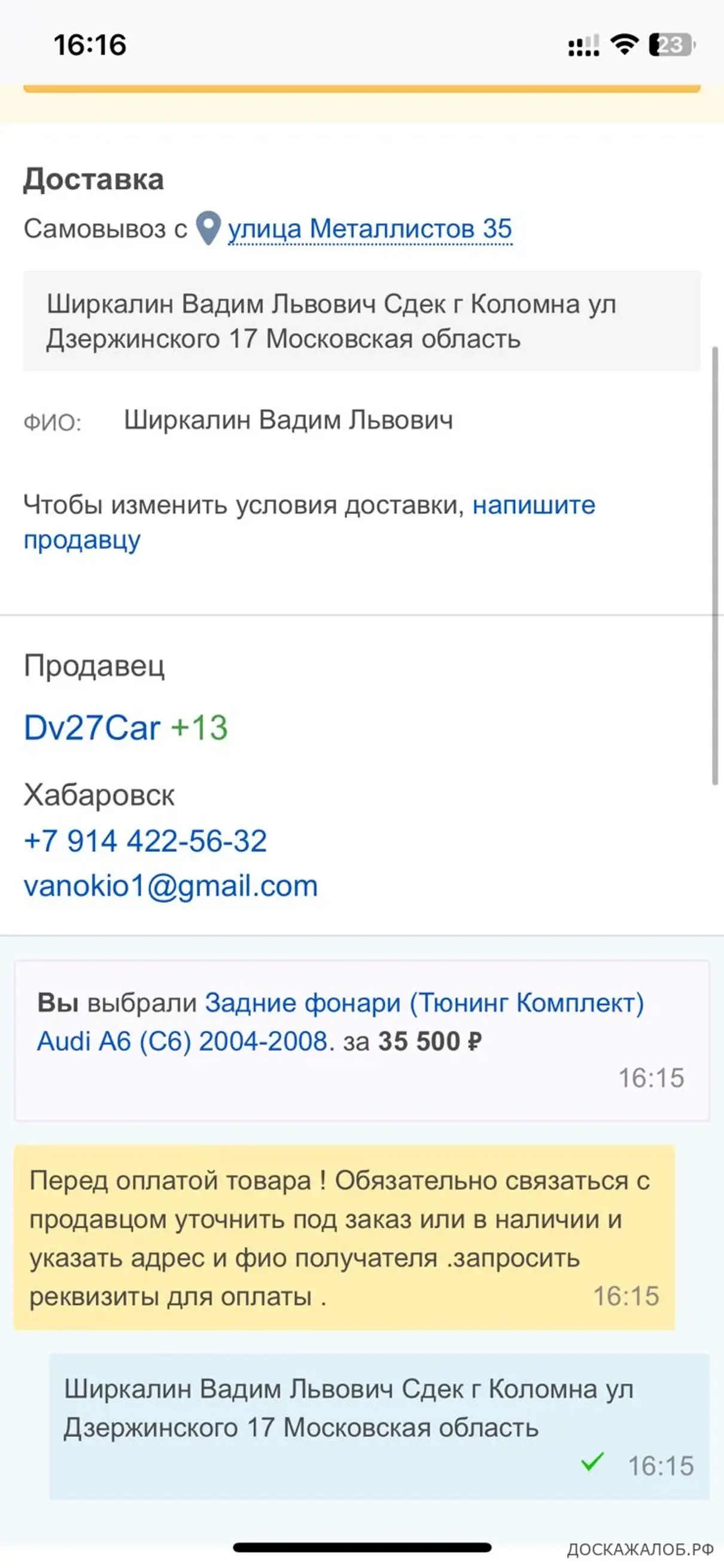 Добрый день! Я Оплатил Ивану З. (+7 914 422-56-32, vanokio1@gmail.com, г. Хабаровск, ) задние фары на АудиА6С6 за 35500р 19.02.24 года, после оплаты в Озоне я видел эти же фары за 52000р, в итоге по истечение 6 месяцев оказалось что Ивана, с его слов, кинул китайский поставщик, и решили уже в январе 25 года, в итоге что с февраля 2025 года Иван будет возвращать финансы незначительными суммами, В итоге последний транш был в апреле 2025 года. Остаток 31000 на сегодняшний день на 20.11.2025года. Я решил больше не ждать возврата, а написать свою историю, чтобы отгородить новых потенциальных «жертв» от возможных финансовых потерь! Иван вызывает сто процентное доверие к себе! Будьте внимательны! Я в первый раз обратился к Ивану и сразу же попал: ни Фар Ни денег, кроме возвращенных 4000 руб.! Я предлагал и по 1000руб в месяц отдавать, но с апреля ни копейки. Мой контакт для обратной связи если Вы попали в такую же схему с Иваном: 8 926-323-86-71 ВатсАП