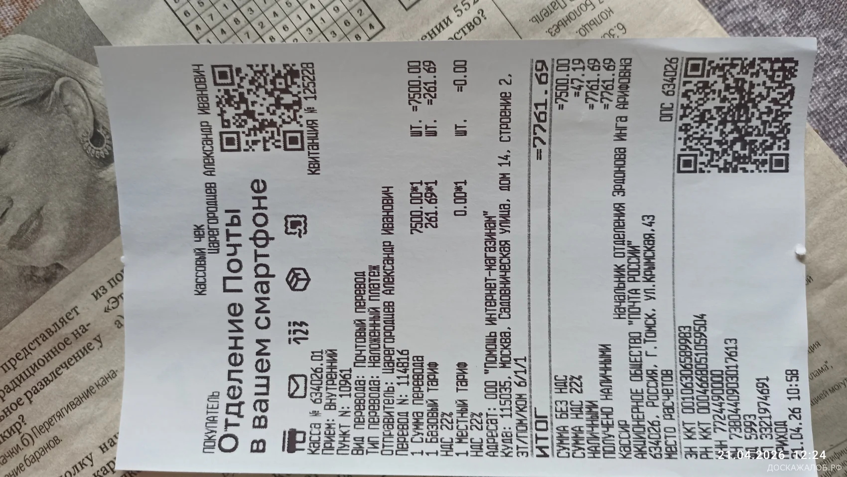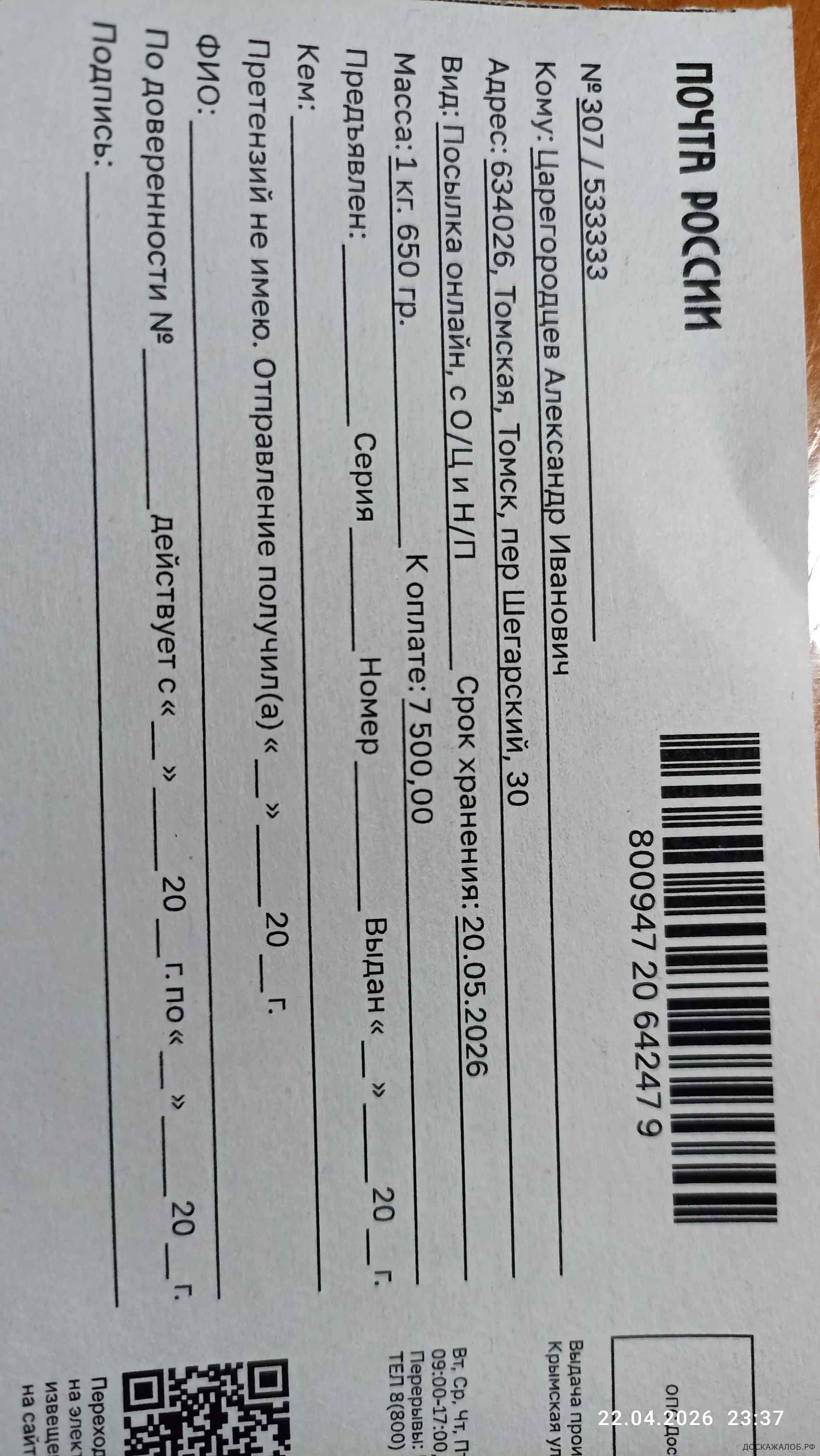 Я житель г. Томск, пенсионер, "Ветеран труда", имею дачу за городом, дорога на дачу грунтовая-плохая, заказал 07.04.2026г по тел. 89664450048 Аккумуляторную авто мойку "Макита-18"в полной комплектации: Без щёточный двигатель, металлический корпус помпы, два аккумулятора, с распылителем 6/1, чтобы с её помощью облегчить мытьё личного автомобиля. 14.04. с тел.79817662166 пришло СМС, что мой заказ: 80094720642479 в ПУТИ, а вечером 18.04. с тел. 89817662166 пришло СМС, что посылка уже на почте! Почта не работает в воскресенье и в понедельник, а 21.042026г я получил почтовое извещение о посылке с нал. платежом :7500,0руб и + Базовый тариф 261,69 руб. 21.04.2026г придя в почт. отд. 634026 г. Томск, кассир Эрдонова Инга Арифовна не разрешила мне вскрыть посылку, ссылаясь на то, что отправитель запретил вскрытие посылки. Оплатив 7761,69 руб, она отдала посылку, вскрыв посылку в почтовом отделении, я убедился, что пришла "Фуфловая" автомойка с одним аккумулятором, щёточный эл.двигатель, всего два варианта для распыления струи, цена которой на ОЗОН не превышает 2000,0 руб с доставкой! Обратно принять посылку и вернуть мне деньги, г. Эрдонова И.А. отказалась! Прошу Вас помочь мне вернуть 7500,0 руб с "Аферистов", которые наживаются на пенсионерах, обманывая нас таким "наглым" образом!
