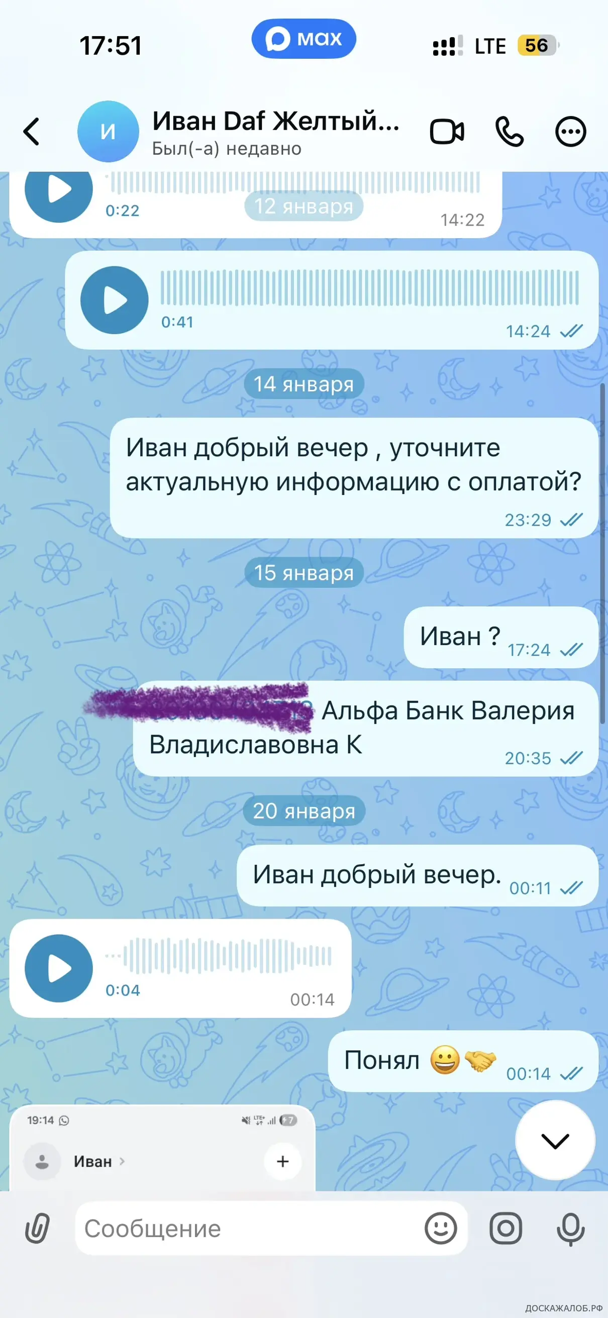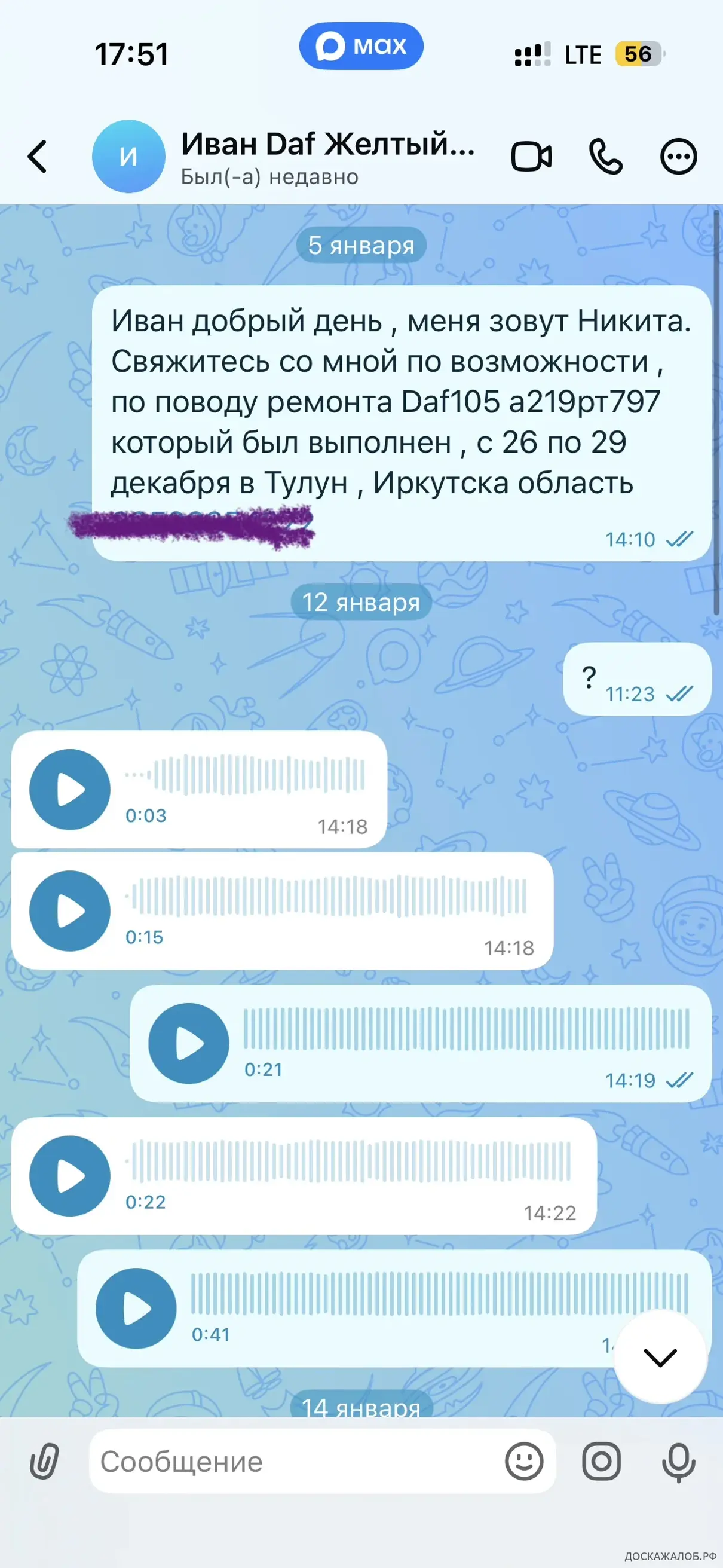 Механик Миша настойчиво просил выпустить машину 29 января, чтобы она успела выгрузиться. После этого через некоторое время он удалил переписку. Генеральный директор 2 месяца кормил обещаниями, а в итоге — полный игнор.