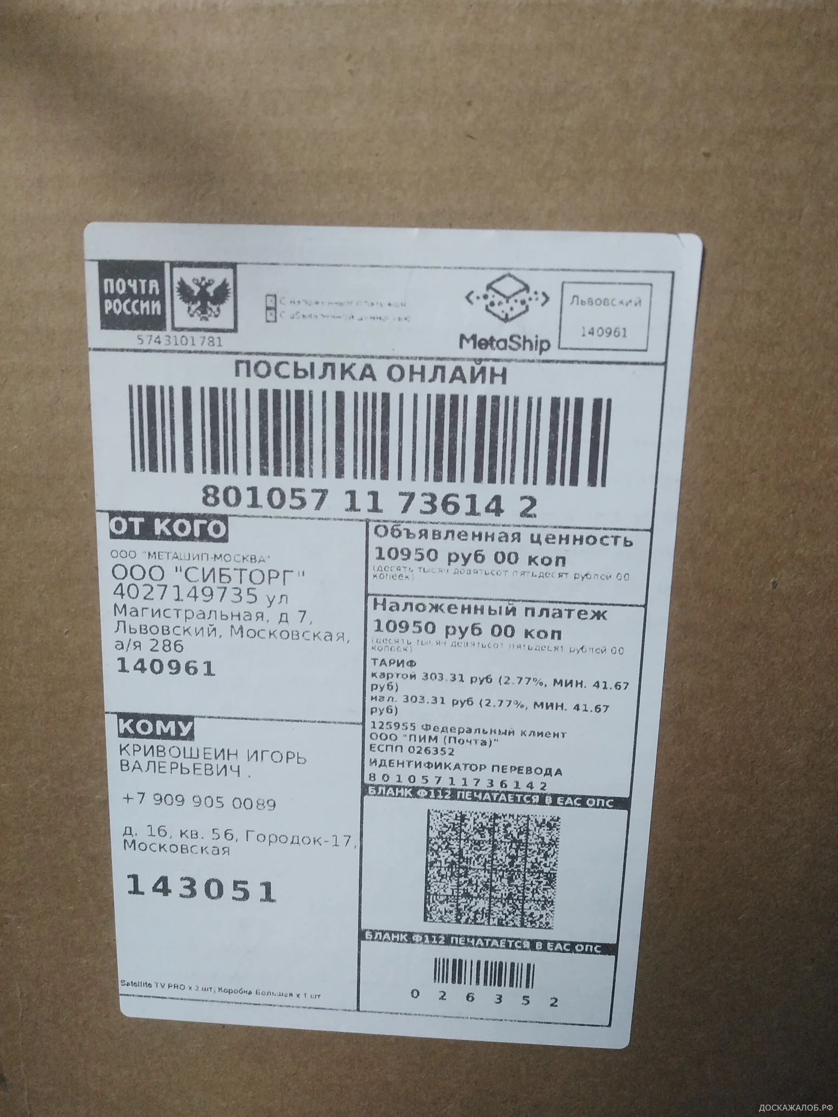 Заказал антену Satellite TV PRO 2 шт. Пришло две пустые коробки в каждой по антене и всё. А где усилитель сигнала, приёмник каналов? И почему коробка заклеина скотчем не почта РОССИ а ООО СИБ ТОРГ Отсылаю фото всё что мне пришло в двух коробках.