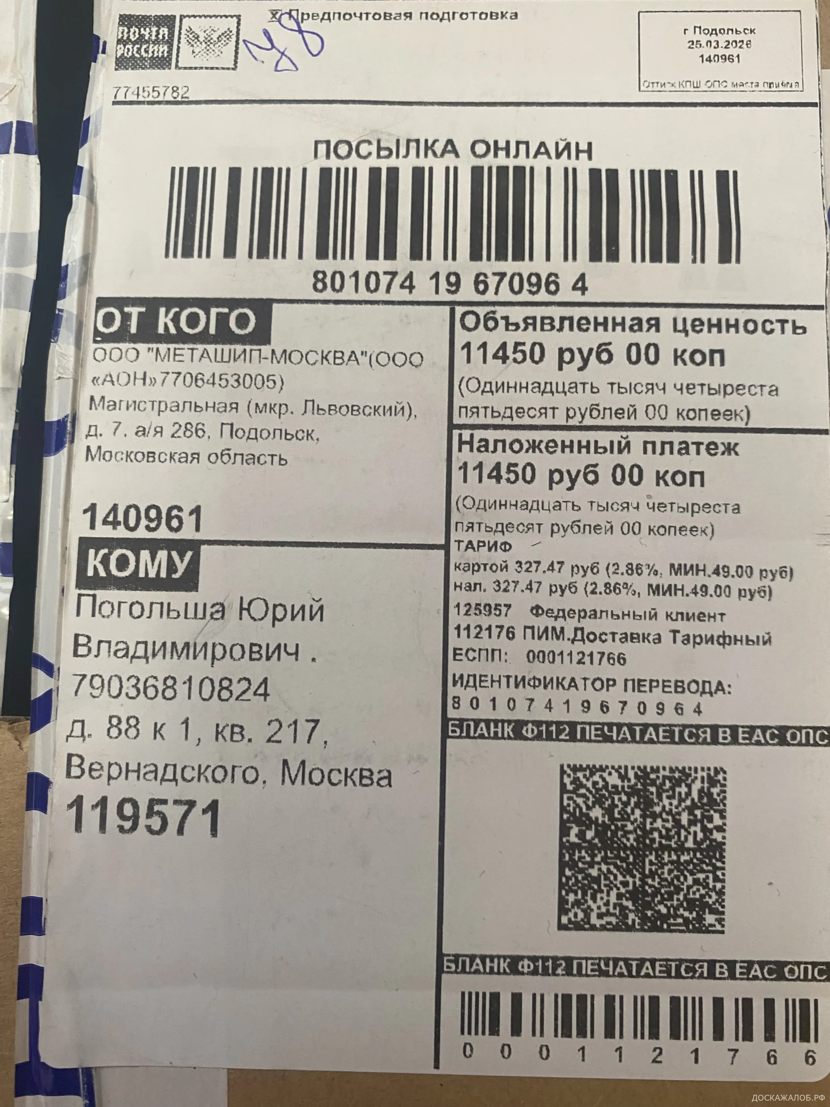 Пришли авточехлы совсем не те, что заказывал, обговорили заказ, марку авто, материал, пошив обещали собственными лекалами именно под мой авто обговорили цвет. Прислали простые магазинные универсальные чехлы-накидки, как тряпки, которые априори не подходят к моей машине, цвет -черный тоже не соответствует, Отправитель Меташип Москва, ООО"АОН", Магистральная, мкр Львовский, д. 7,а/я 286,Подольск. Прошу разобраться, и вернуть денежные средства в размере 11 849 + 1567 = 13 416 руб.. В случае неразбора ситуации будем вынуждены обратиться в прокуратуру. Посылку обратно отправил.