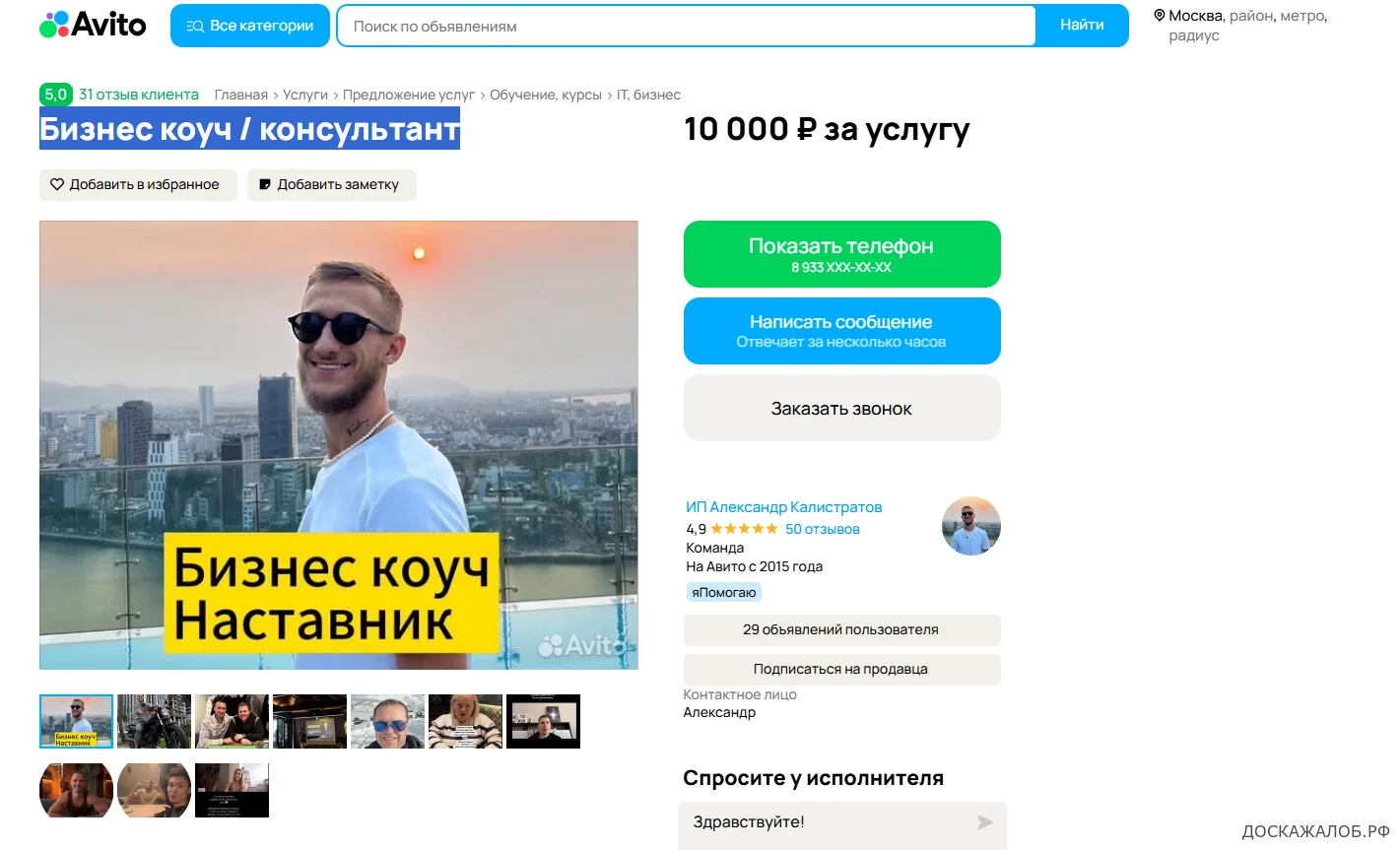 Калистратов Александр мошенник. Бизнес коуч который закончил актерские курсы. Берется за продажу вашего бизнеса но вся суть его работы только в том что он выставляет обьявление на авито. Потерял с ним время и деньги.