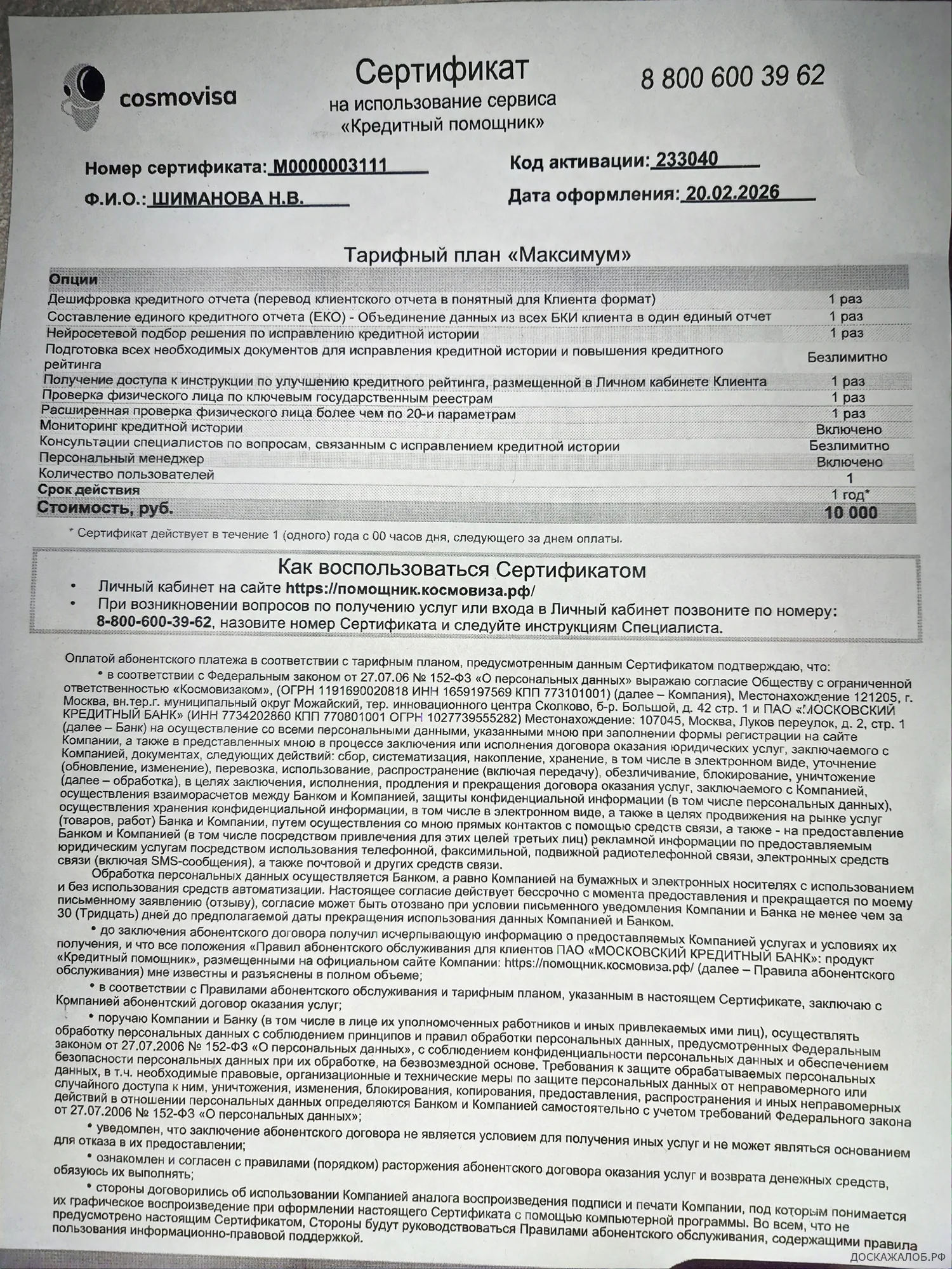 20.02.2026 года мной был оформлен ипотечный кредит, в рамках которого "под шумок" (поскольку подписание бумаг происходит в приложении) банком оформлен некий сертификат "Кредитный помощник" от компании Космовизаком. В приложении бумаги именуются как страхование, по факту же никакое это не страхование. Космовизаком работает в рамках абонентского договора, оказывает непонятного рода услуги. А Банк ВТБ их партнер. Стоимость этой услуги 10000 руб. И вернуть их Космовизаком наотрез отказывается, не забирает пакет документов с заявлением на возврат с Почты России. Очевидное нарушение банком закона о защите прав потребителей.