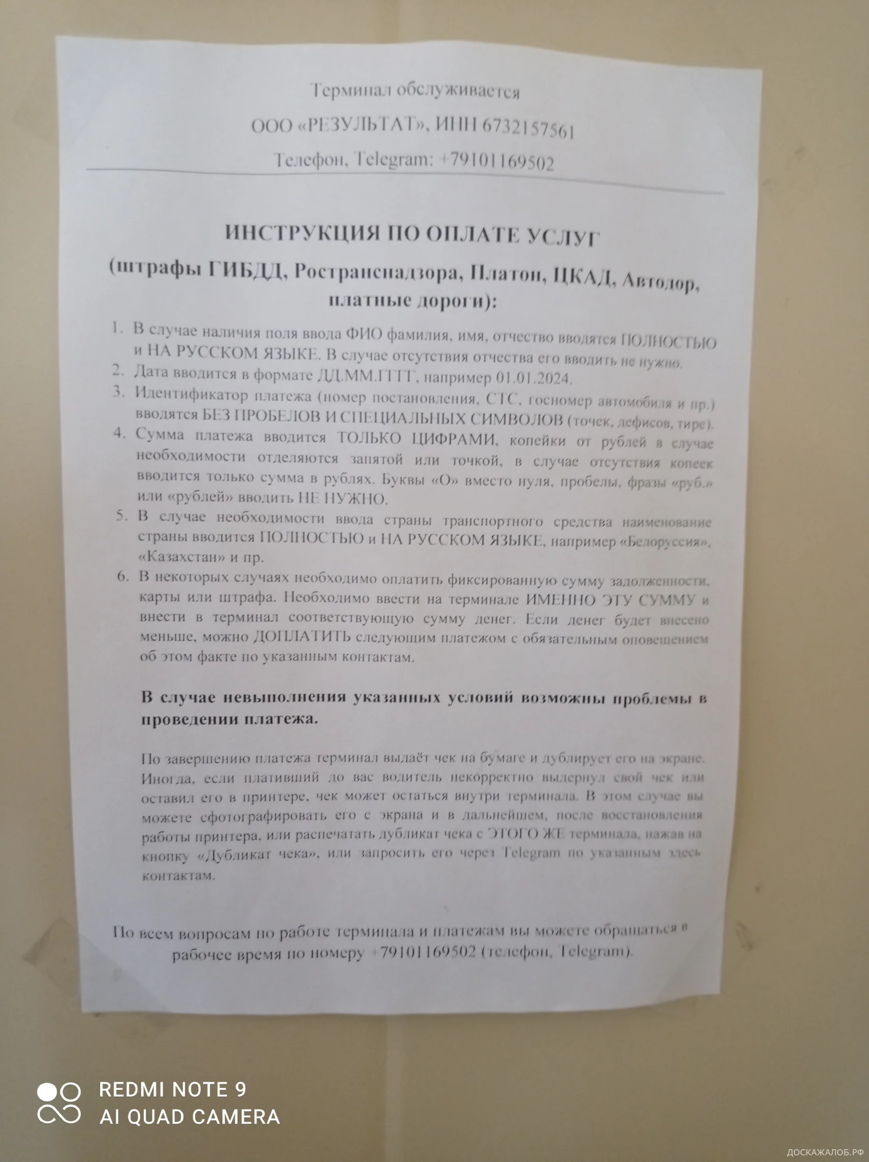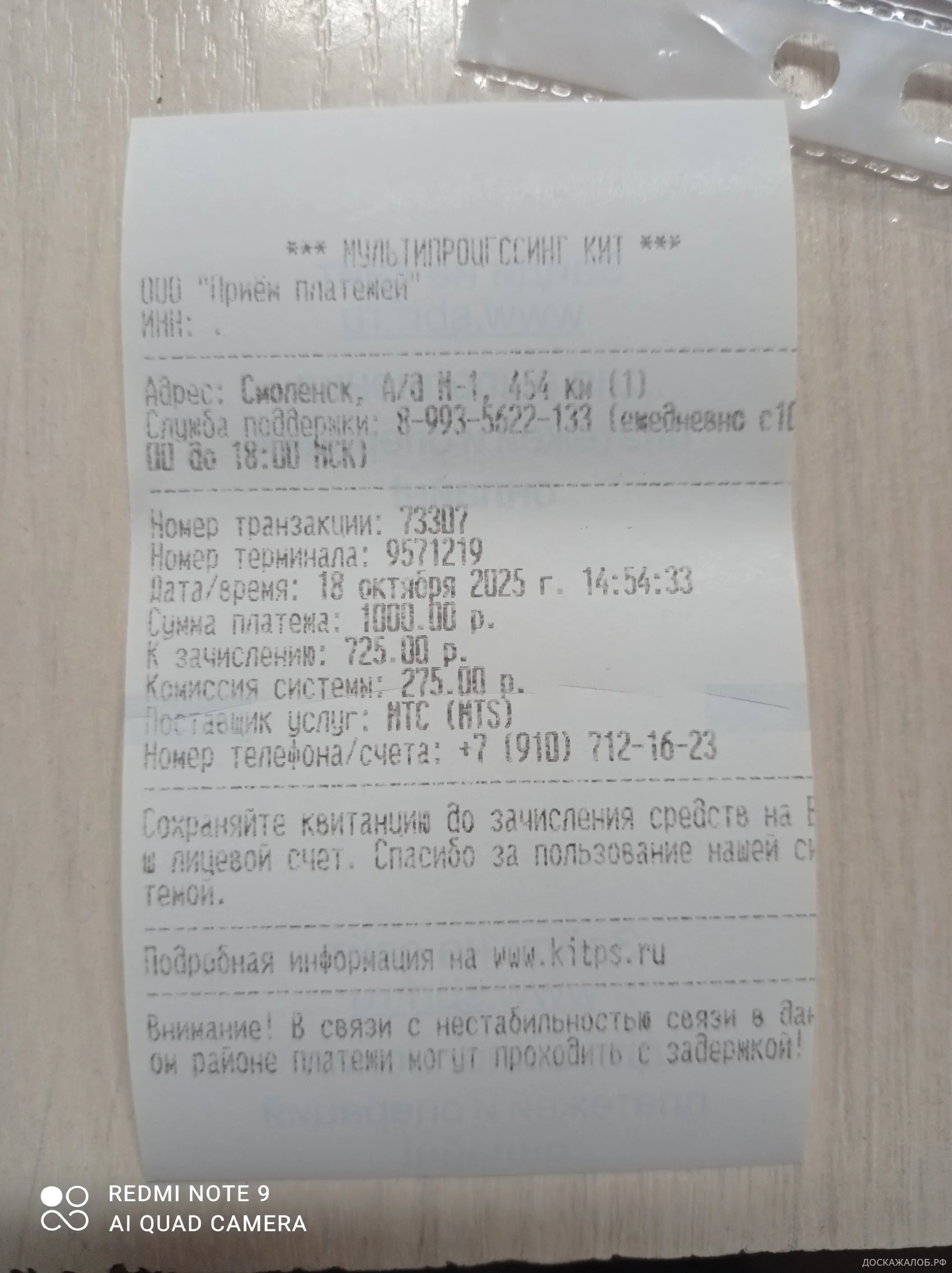 Положил деньги на телефон через этот терминал, принадлежащий частному лицу. Деньги так и не пришли, в службу поддержки не дозвониться!! Терминал находится на границе РБ/РФ, нп Красная Горка, в сторону Москвы. Адрес: Смоленск, а/д М-1, 454 км. Дата 18.10.2025, время 14:54, сумма 1000 руб, комиссия 275 руб, номер транзакции 73307, номер терминала 9571219.