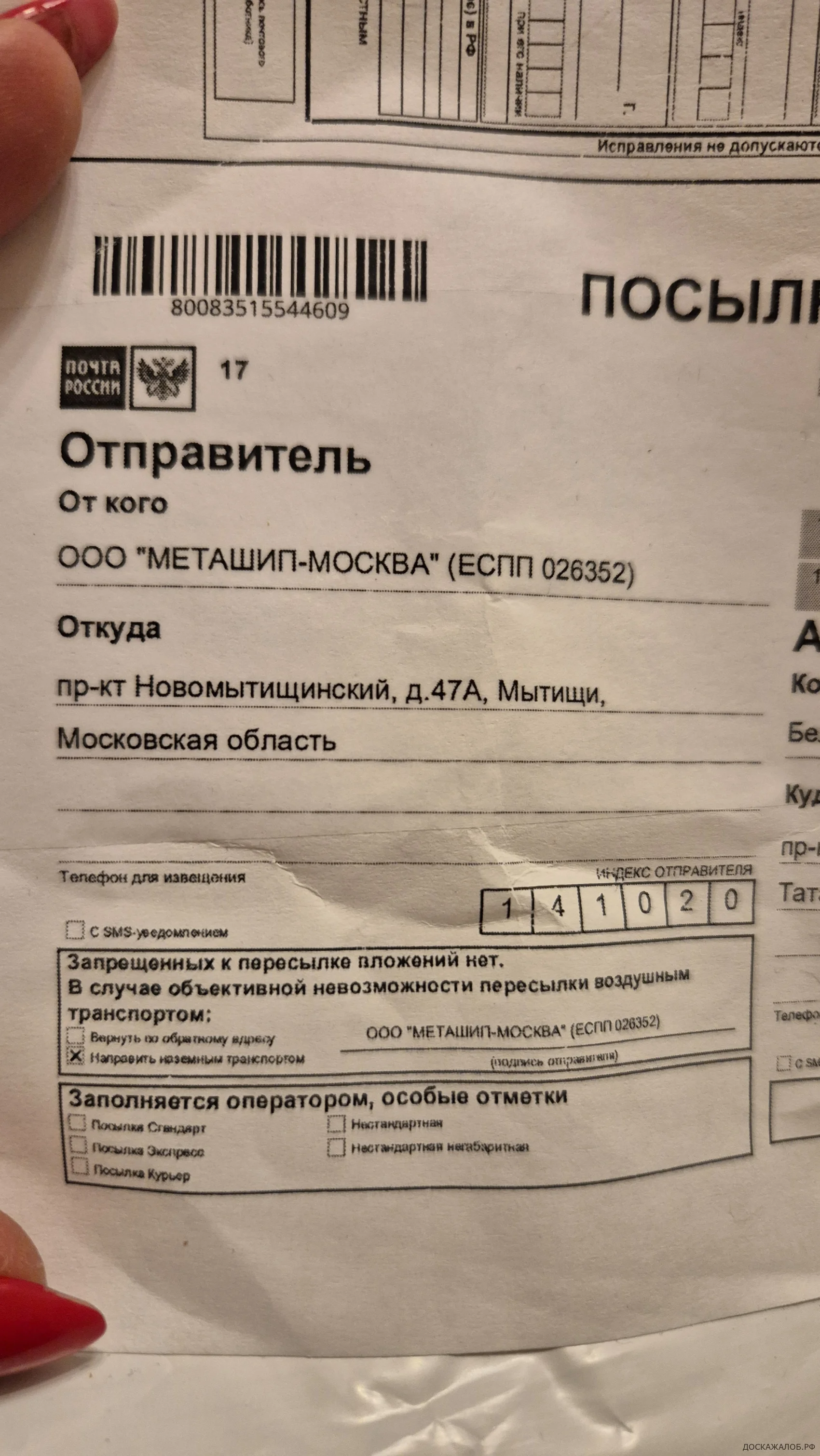 Отправитель указан как ООО Меташип-Москва. Похоже, действует какая-то мошенническая схема. Оплачиваешь товар за 12 000 рублей, а присылают за 5 000 рублей, и решить вопрос не получается, так как отсылают на несуществующий адрес. В интернете видела не один отзыв на эту компанию о мошенничестве подобным образом.