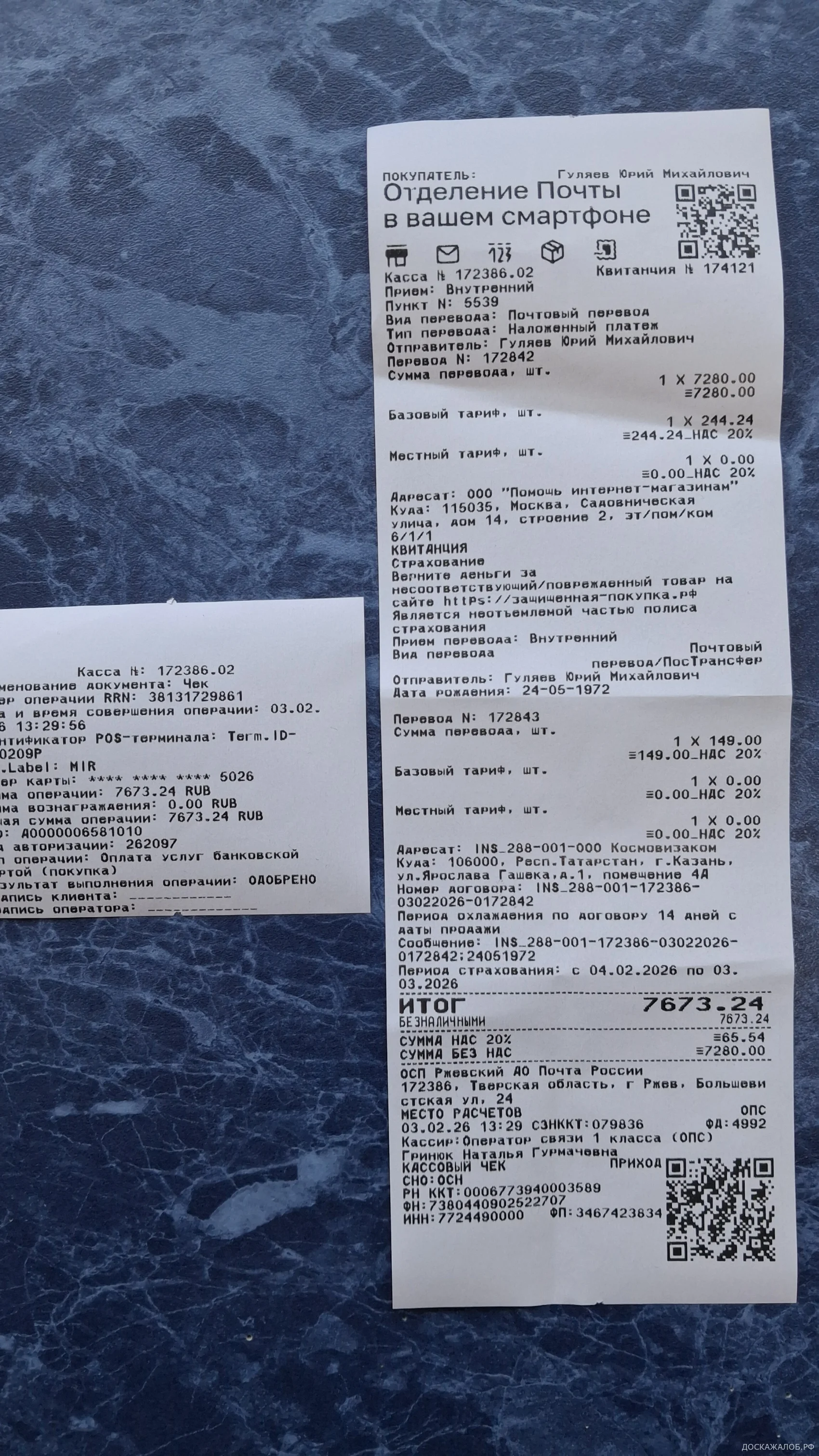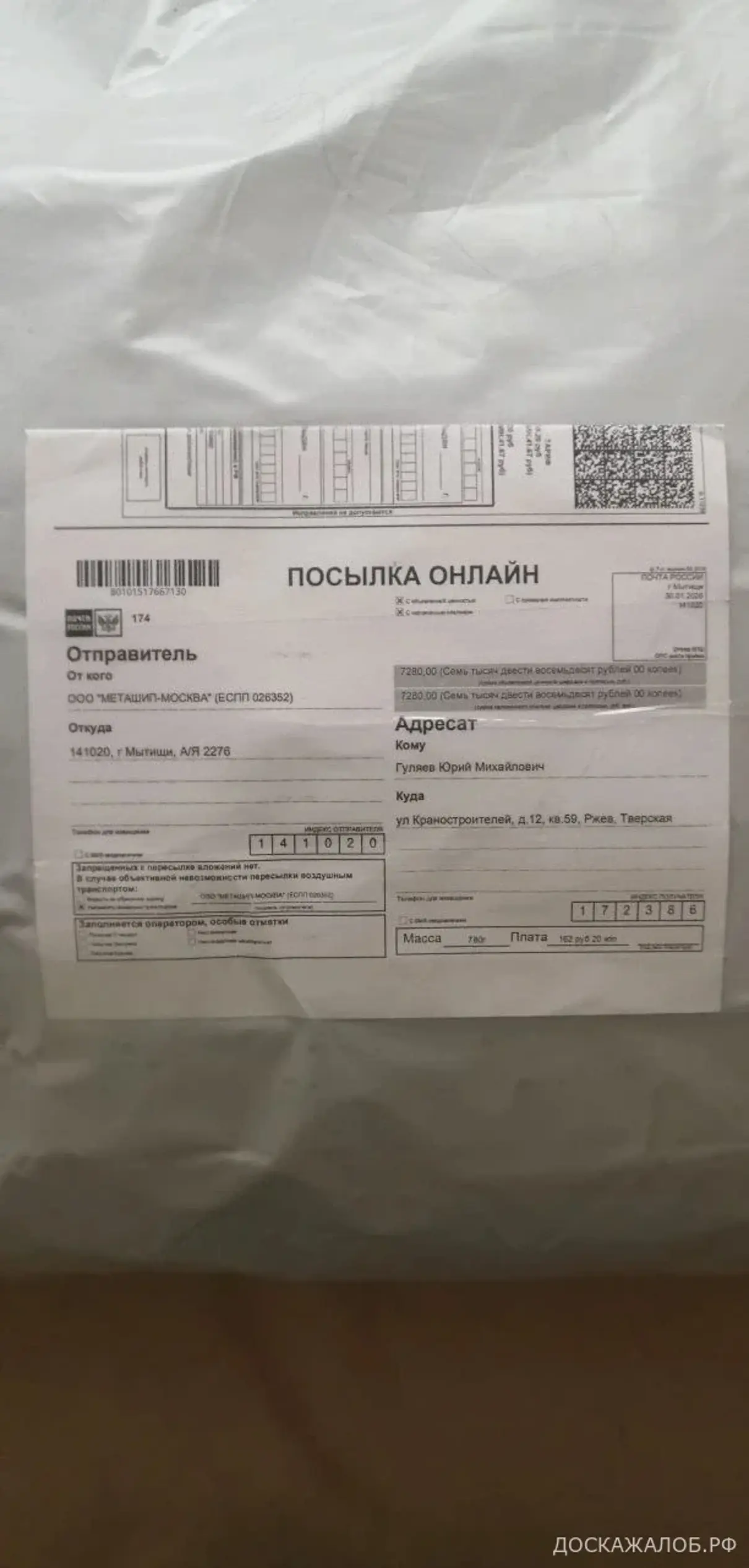 03.02.2026 года на почте получил посылку по № заказа 80101517667130. Посылку не отдавали, пока я за неё не заплатил. Открывать на почте не стал и радостно побежал домой мерить свой новый, красивый рыбацкий костюм «ПОПЛАВОК».