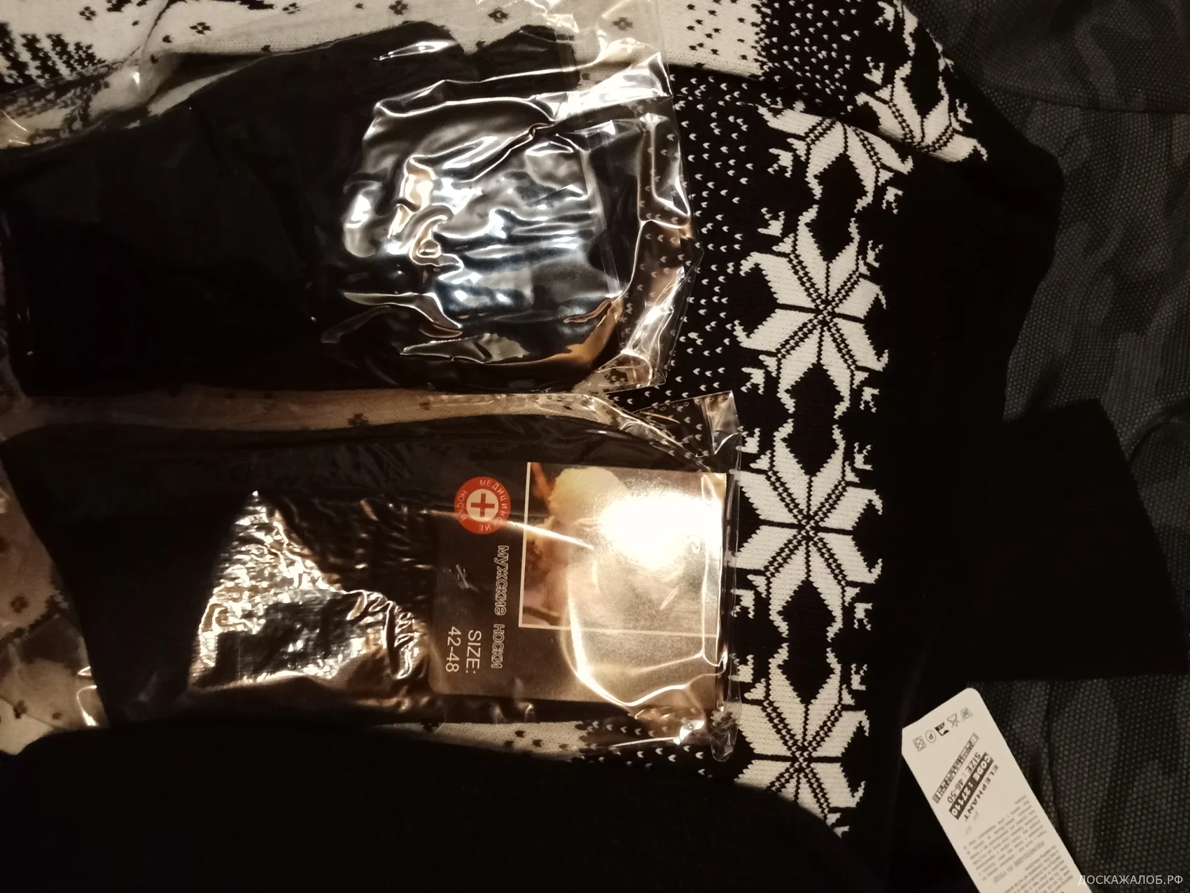 При вскрытии обнаружилось, что внутри находится совсем другой зимний костюм, из самых дешёвых. В комплекте должно быть ещё термобельё, но вместо него — какая-то кофточка, перчатки и обычные носки.