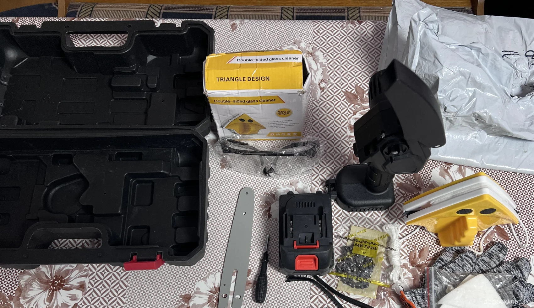 Я заказывал аккумуляторную пилу с шиной 350 мм, двумя цепями, двумя аккумуляторами и смазкой для механизма. Фактически была доставлена пила (no name) с шиной в два раза меньшей длины, одним аккумулятором, одной цепью, без масляной смазки. В посылке также находилось приспособление для двустороннего мытья окон, которое я не заказывал.