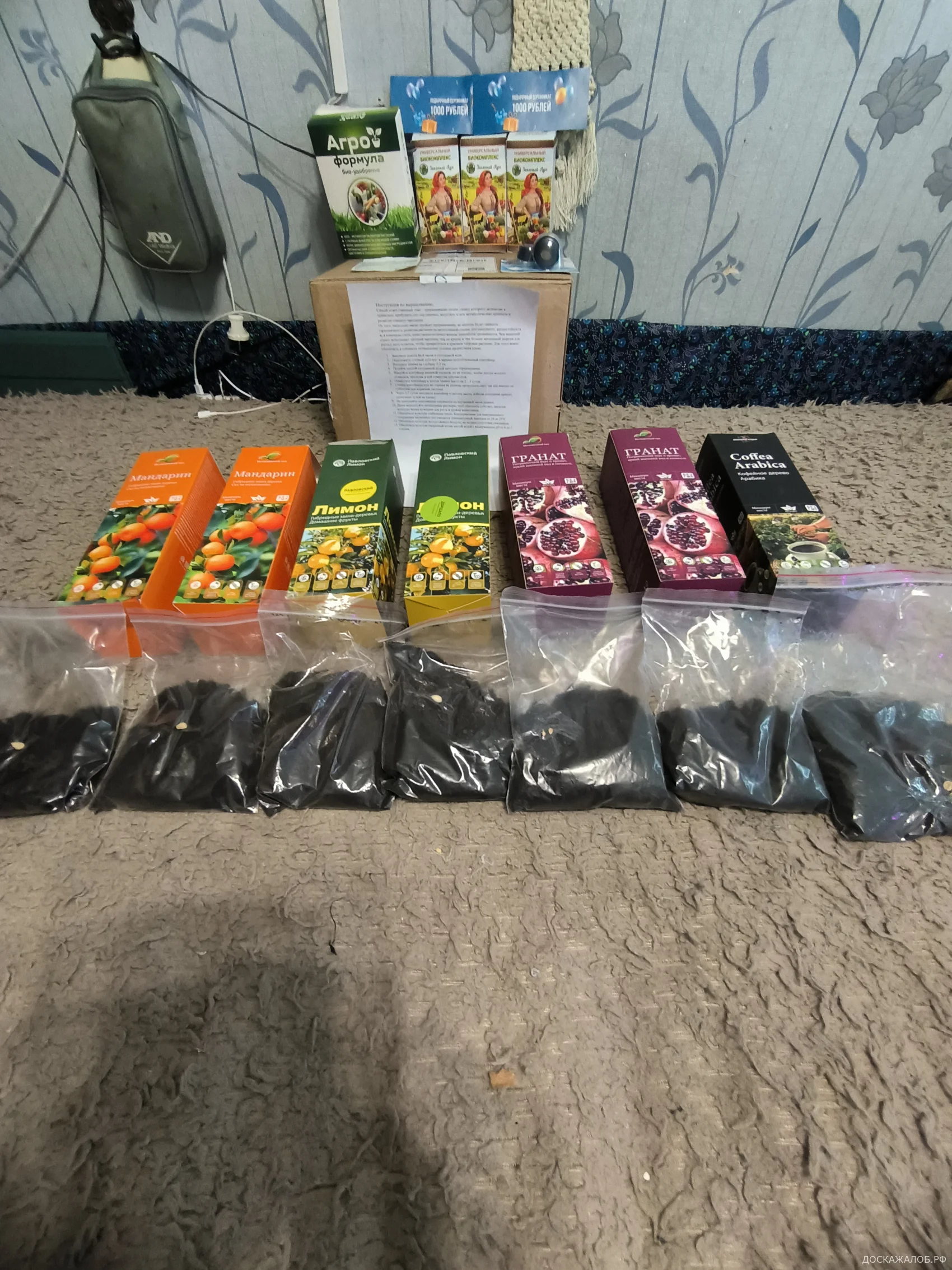 В подарок предложили зёрна кофейного дерева, сертификат на 10 тыс. руб. и какие-то удобрения. А по факту я получила: 1 зёрнышко лимона, 1 — мандарина, 2 — граната, 2 кофейных зёрнышка, но они разломаны, то есть уже не взойдут. А вместо обещанного сертификата на 10 тыс. руб. прислали 2 по 1 тыс. руб.