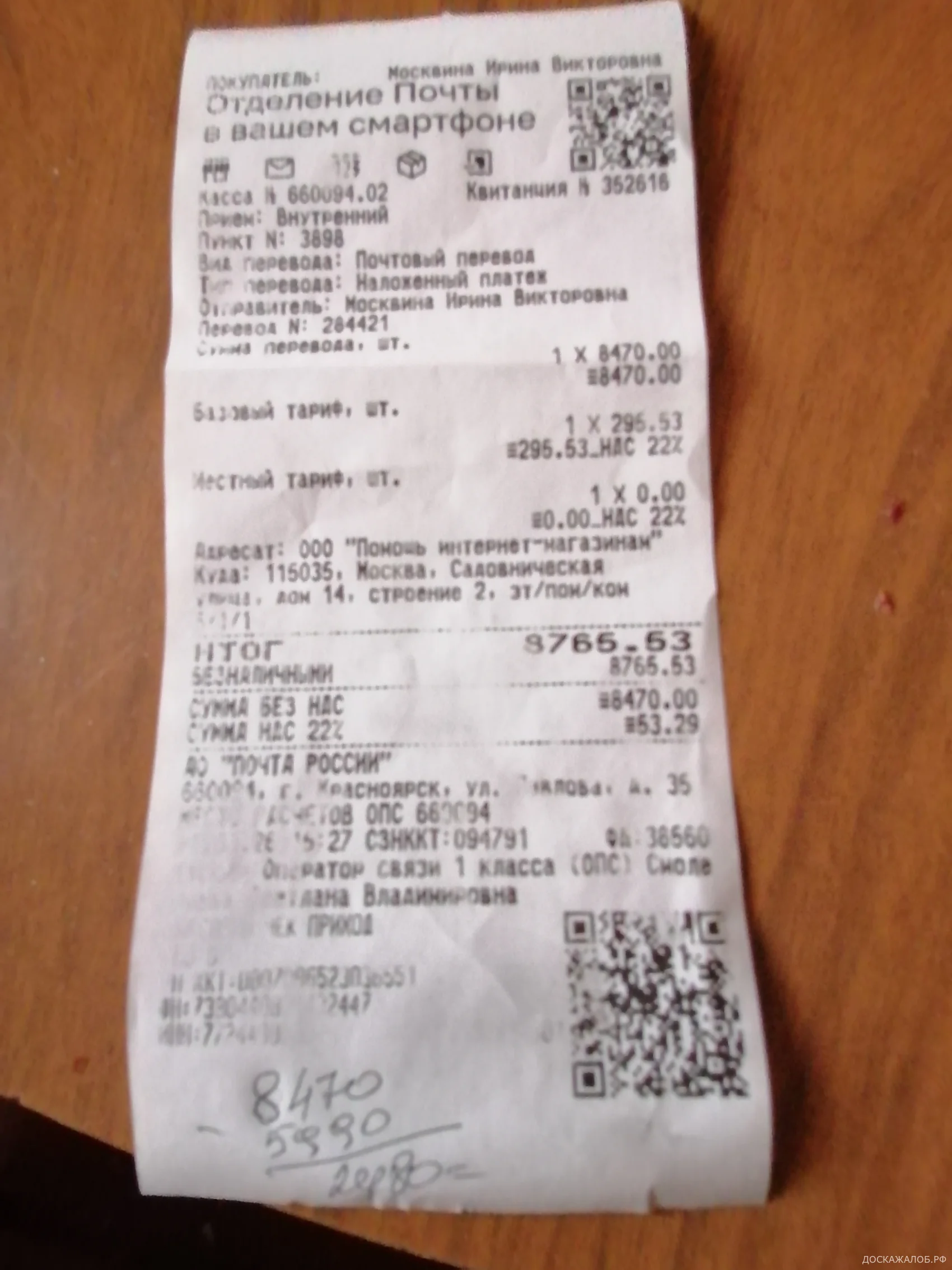 Я, Москвина И.В., проживающая в г. Красноярске по ул. Щорса52 - 23.заказала по акции культиватор и средства (масло, инструменты и т.д.) для обслуживания его. Всего на сумму 8470руб.,в т.ч. культиватор 5990.Культиватор доставлен, оплата в сумме 8470руб.произведена полностью, а сопутствующие указанные в договоре товары не доставлены. Прошу разобраться и сделать поставку, уже опла, еннуюполностью или вернуть мне разницу всумме2480 руб. С ув. Москвина И.В.