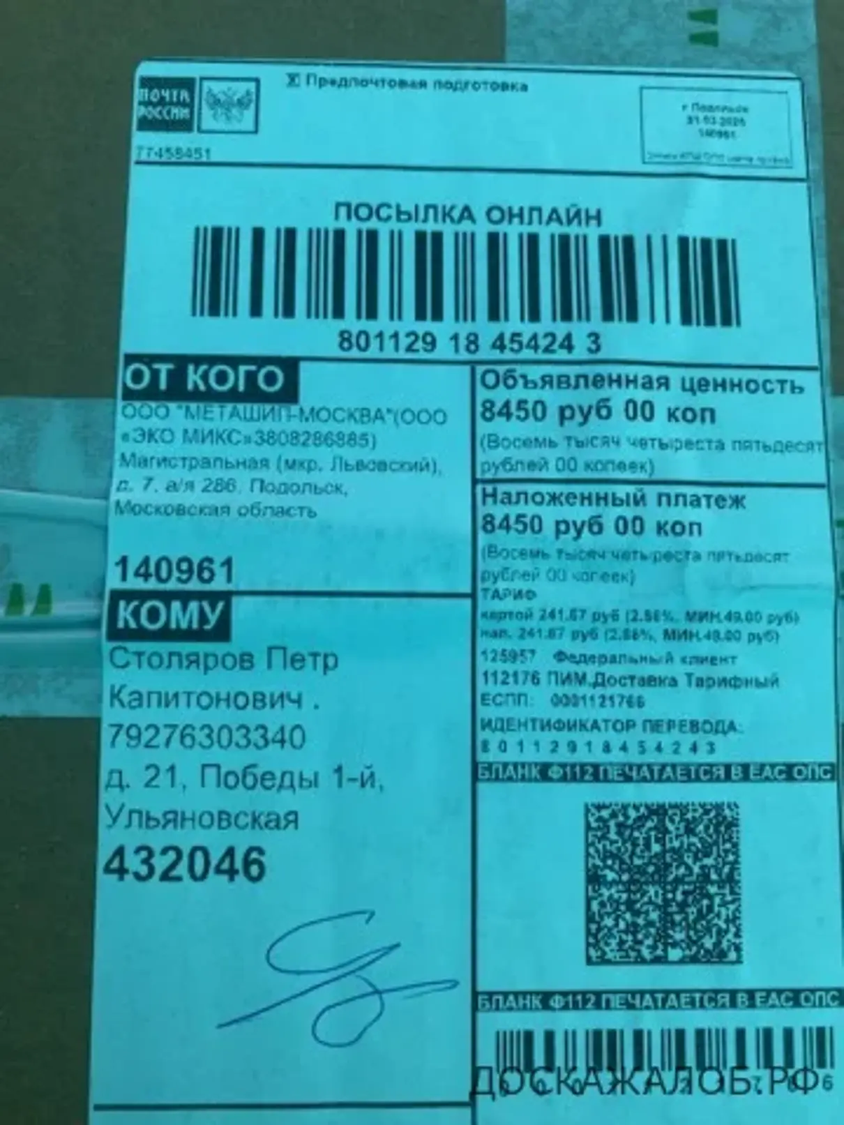 Фото копия адрес отправителя: ООО "МЕТАШИП-МОСКВА"(ООО «ЭКО МИКС» 3808286885) Магистральная (мкр..Львовский), д.7, а/я 286, Подольск, Московская область.
