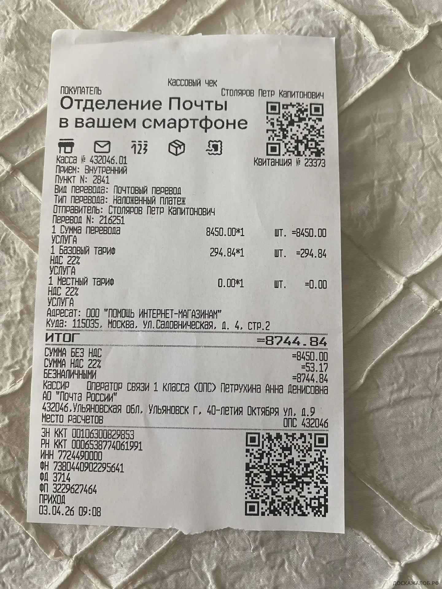 3 апреля 2026 г. 432046, Ульяновск посылка с товаром была получена, мне не разрешили ее вскрыть. сумма оплаты составила 8 тыс. 744 руб. 84 коп (копия чека от 3 апреля 2026 г. 432046, Ульяновск, прилагаю). Адресат: является ООО «ПОМОЩЬ ИНТЕРНЕТ-МАГАЗИНАМ» ОГРН: 1177746728587 Генеральный Директор Сатановская Ольга Сергеевна адрес: 115035, Москва ул. Садовническая , дом 4 стр.2.