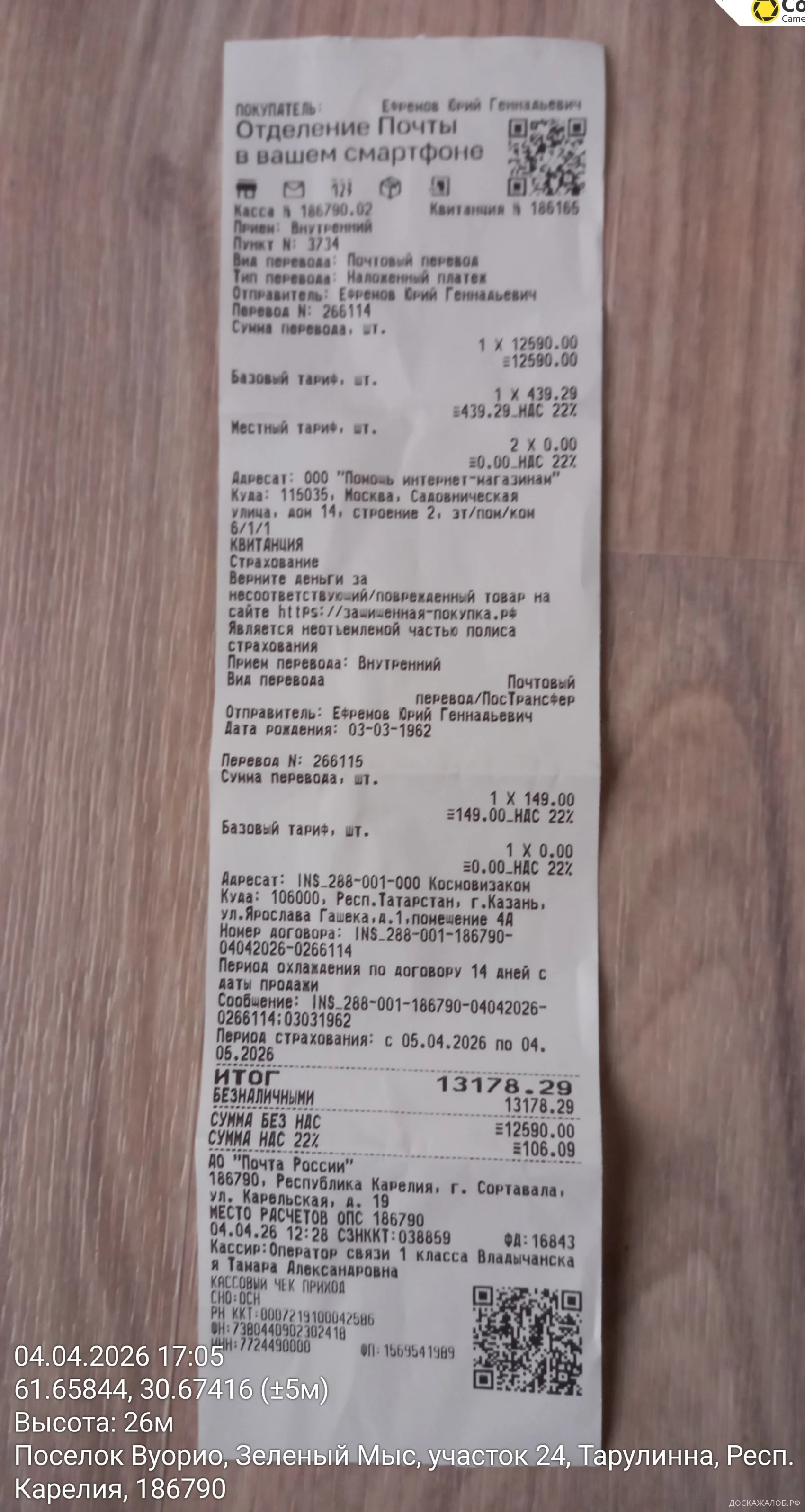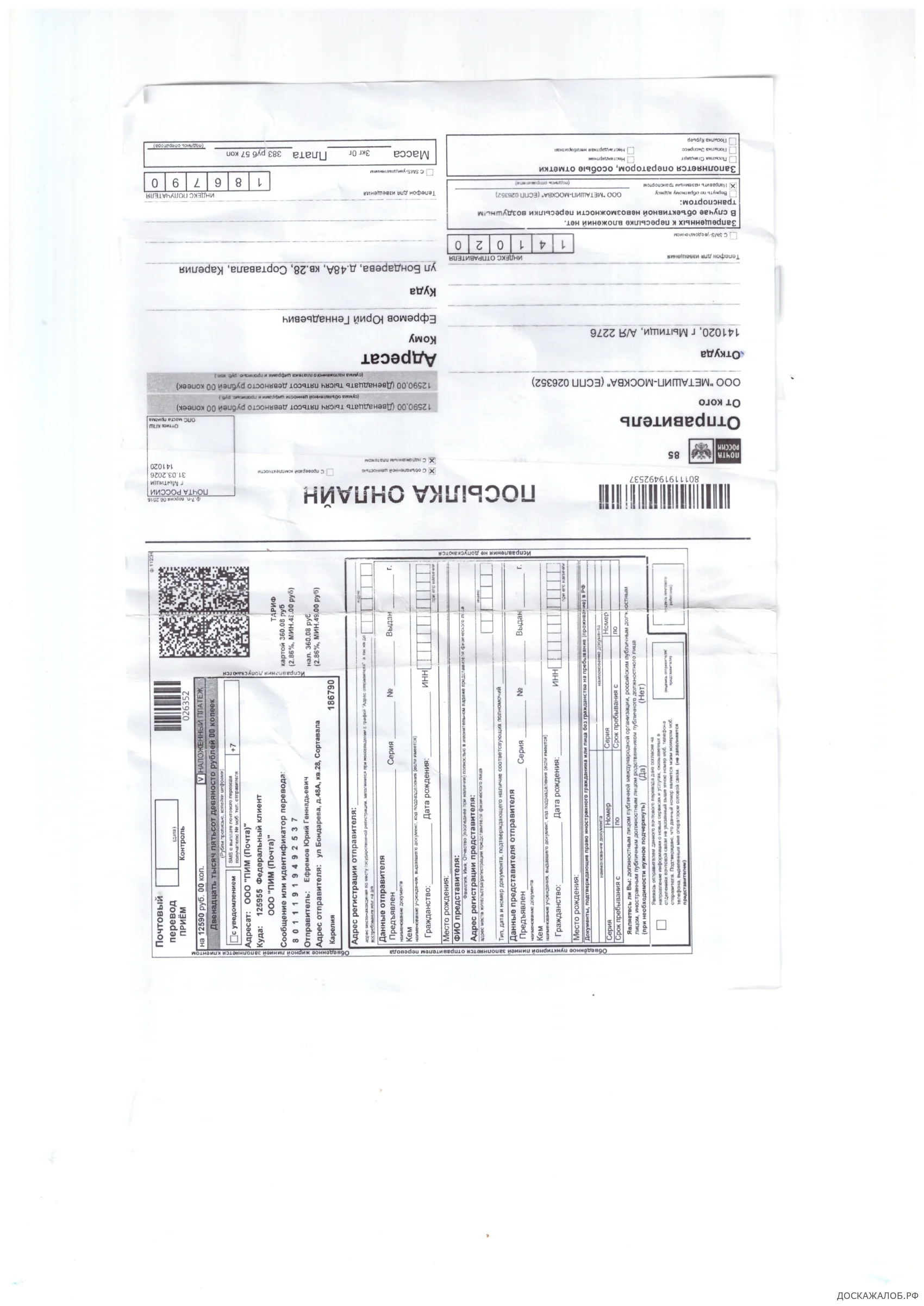 4 апреля 2026 г. мною посылка с товаром была получена, сумма оплаты составила 12 590 руб. с учетом комиссии Почты России (копию чека от 4 апреля 2026 прилагаю). Адресатом являлся ООО «МЕТАШИП-МОСКВА» (БАЙТОРГ),