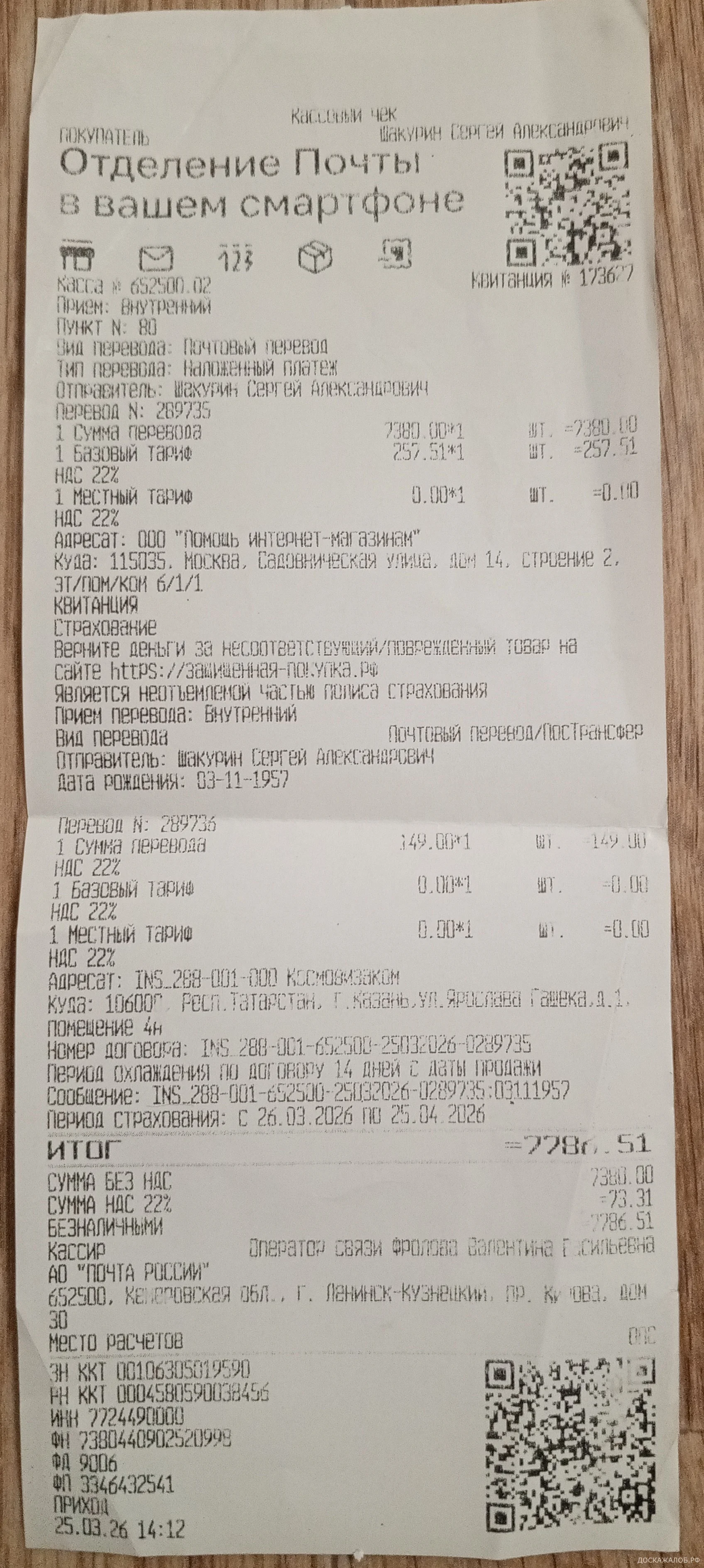 Мной оплачен данный товар на сумму 7380 RUB. наложенным платежом на почте.