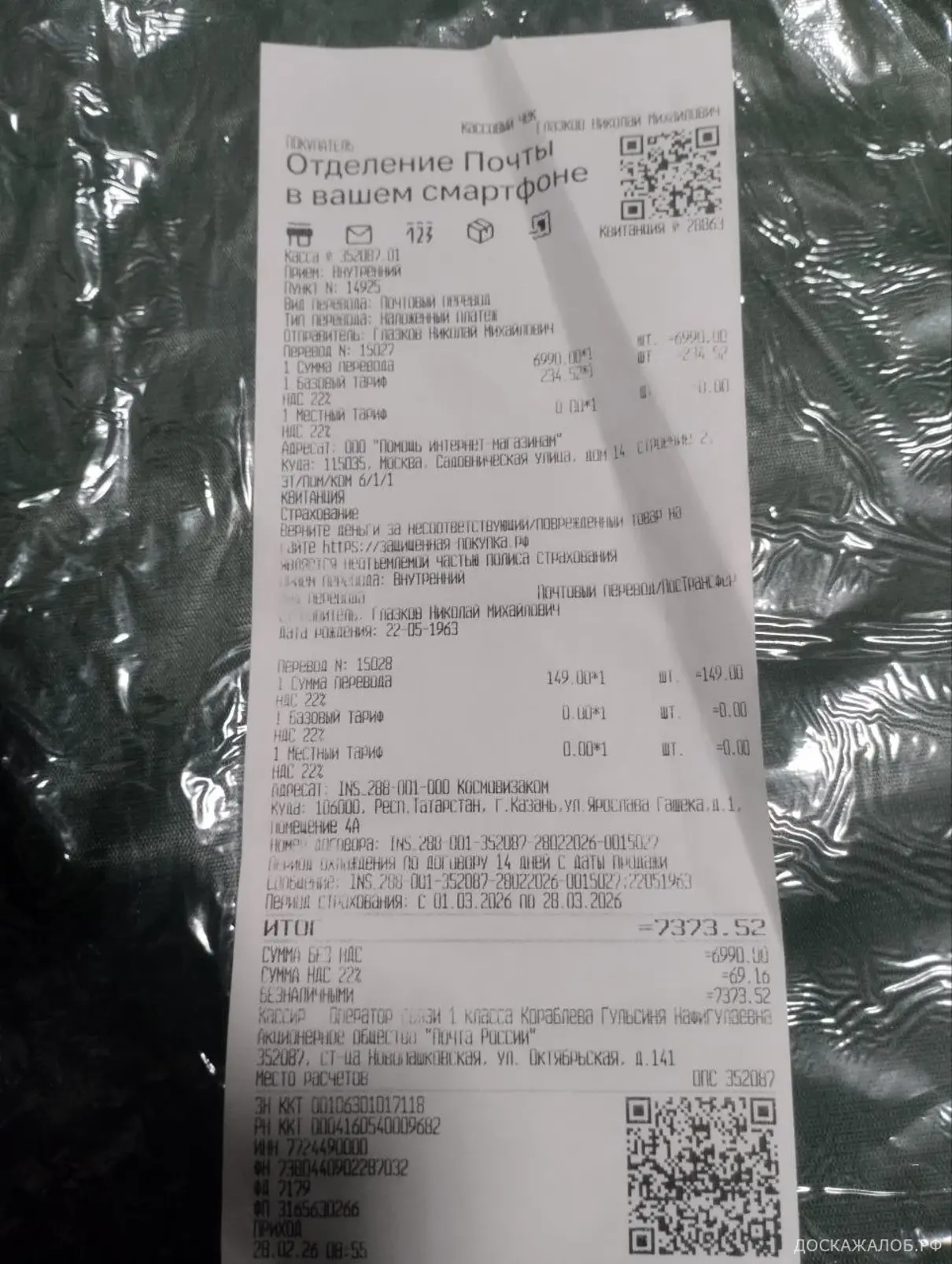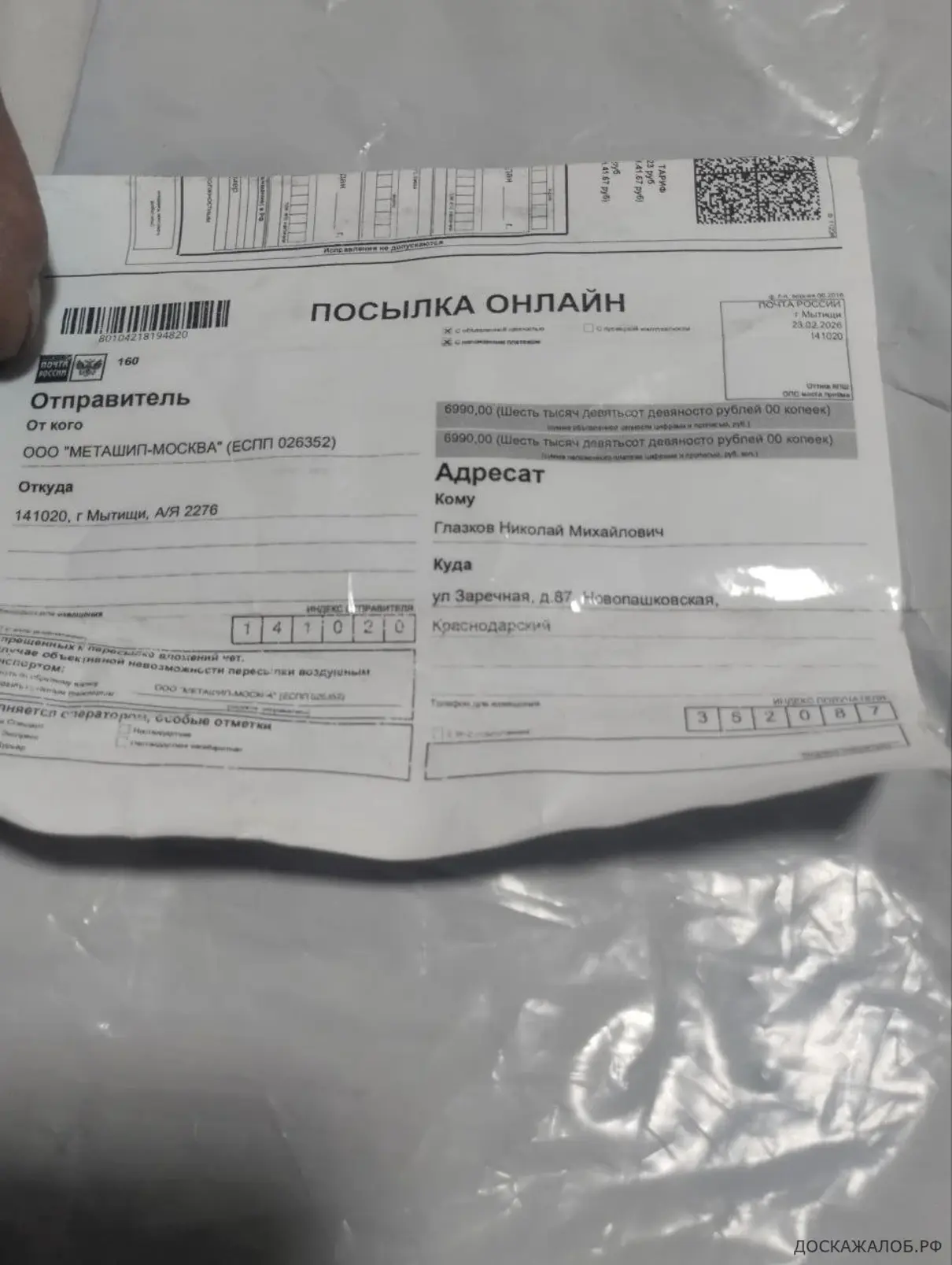 Прислали не тот товар. Номер заказа 80104218194820 на сайте https://donka-croco.tilda.ws/ Товар получил 28.02.2026 в 08:55 открыть на почте не дали сказали только после оплаты. Когда открыл оказалось несоответствие товара. Когда я оставил жалобу, началась переписка с spacemag123@gmail.com отделом претензий прикреплю файл к жалобе. После продолжительной переписки написали, что вернут половину стоимости товара в течение 10 дней. Но прошло уже намного больше дней, а денег так и нет. Я подозреваю, что это мошенники, и на телефон не отвечают. Во вложении прикладываю фото: кассовый чек наложенный платеж, квитанцию и лицевую сторону приложения к посылке где указаны получатель и отправитель, фото комплекта который пришел