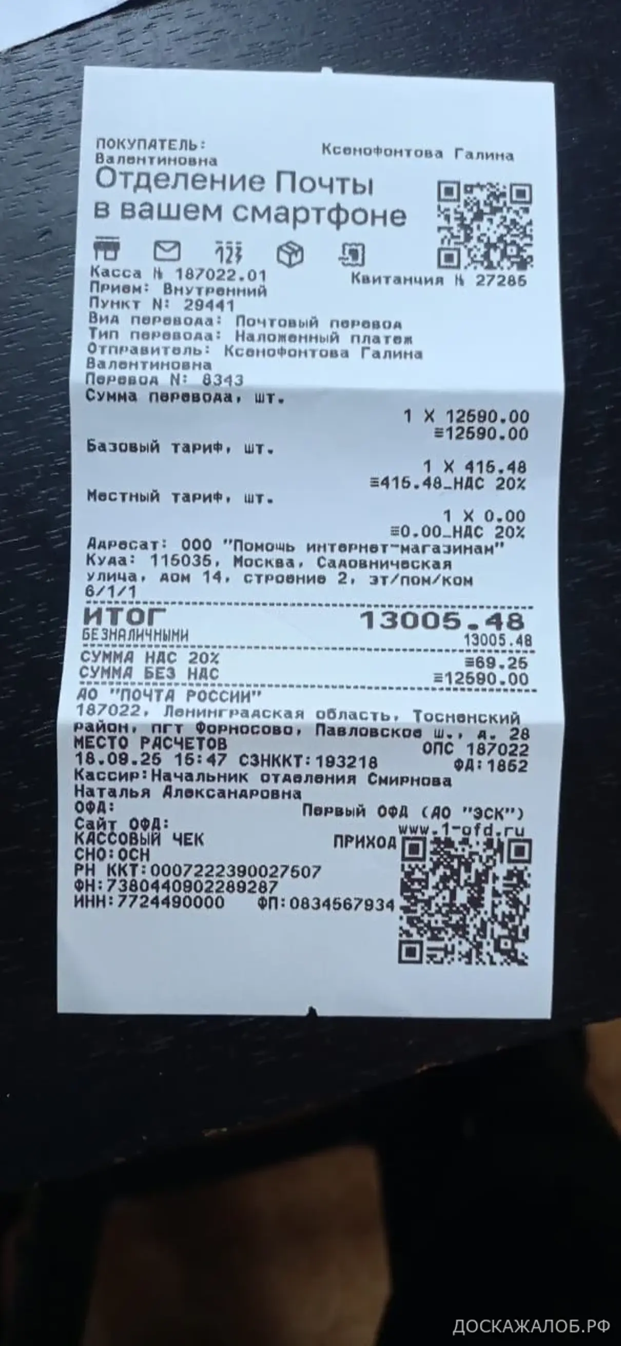 Товар был получен без осмотра и оплачен в полном объеме, включая удержание за почтовую пересылку, в почтовом отделении. Перевод №8343 от 18.09.25 на сумму 12590р+415,48 (пересылка) выполнен на адресата ООО «Помощь интернет-магазинам».