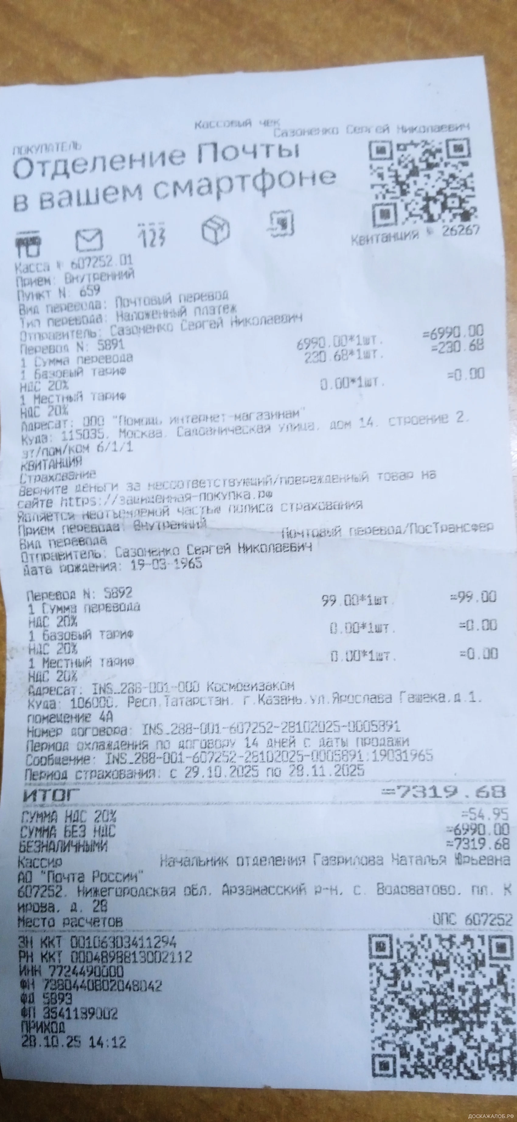 Также обращаем ваше внимание на то, что теперь содержимое посылок с наложенным платежом можно проверять перед оплатой (https://www.pochta.ru/news/item/post-784). Обязательно пользуйтесь этой возможностью в дальнейшем. Удачных вам покупок.