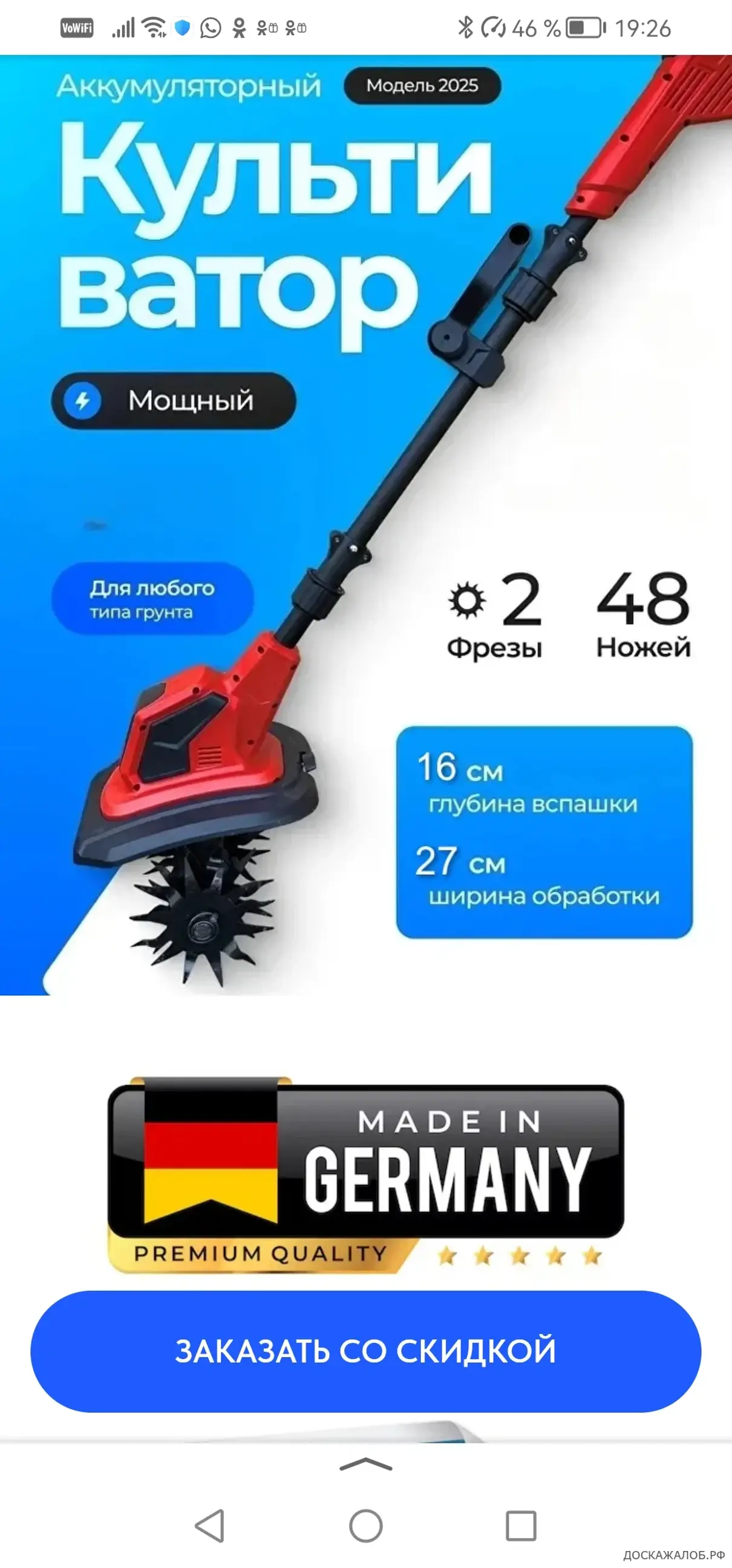 1) культиватор аккумуляторный немецкой технологии за 5990 рублей по акции с одним аккумулятором на 48 В красного цвета.