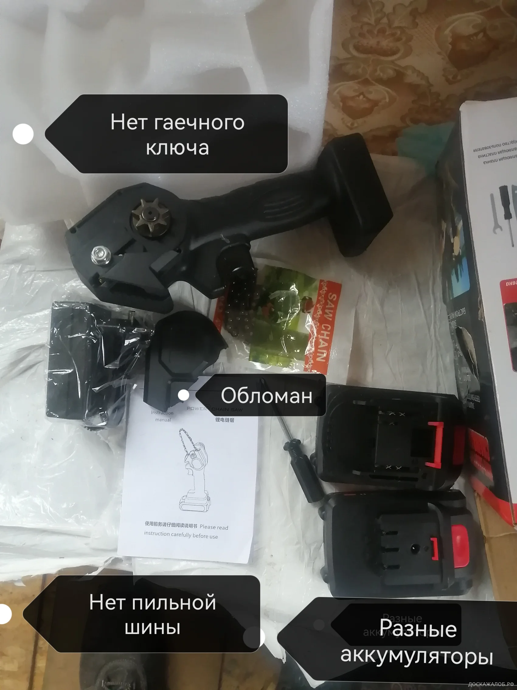 2) сучкорез цепной аккумуляторный на 24 Вольт. По комплекту:2аккумулятора-разные, один подходит, другой неизвестно от чего. Нет пильной шины. Нет гаечного ключа. С корпуса отколота защитная крышка.