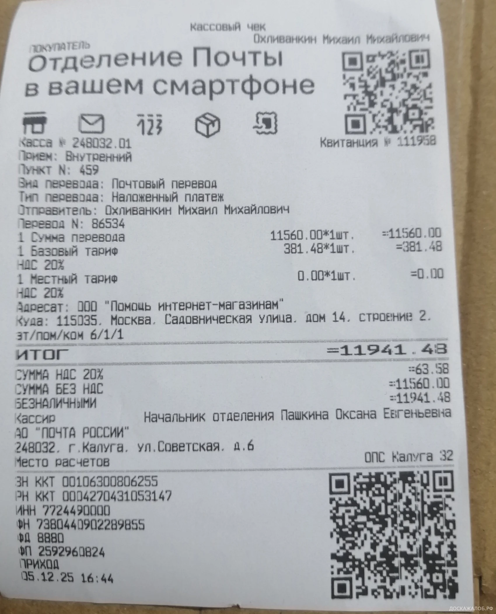 То есть полностью не мой заказ. На почте при получении посылки не разрешили до оплаты посмотреть товар. Оплатил. Вскрыл при сотруднице почты посылку, убедился, что не мой заказ. Говорю, что возврат, а она посылку назад не принимает и деньги также не возврашает. Решайте с Поставщиком!