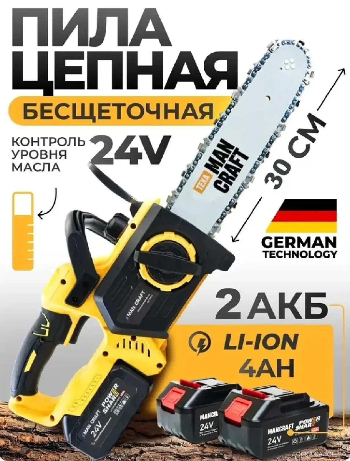 2) аккумуляторная бесщеточная пила немецкой технологии Mankraft с пильной шиной 12" с 2-мя аккумуляторами 24 В за 2990 рублей.