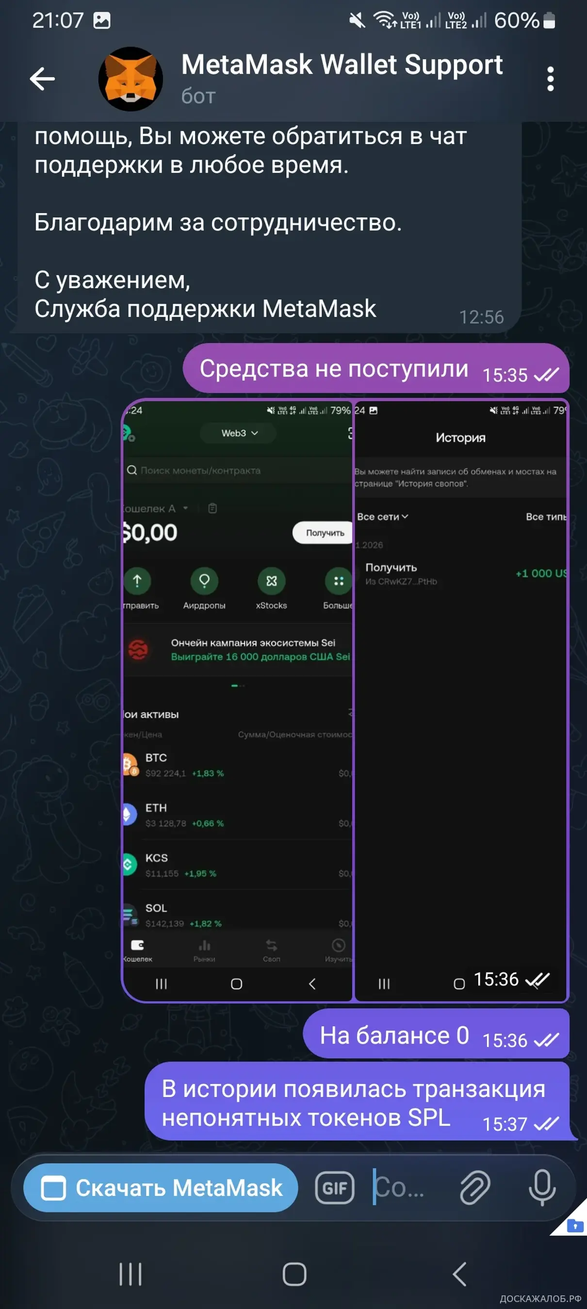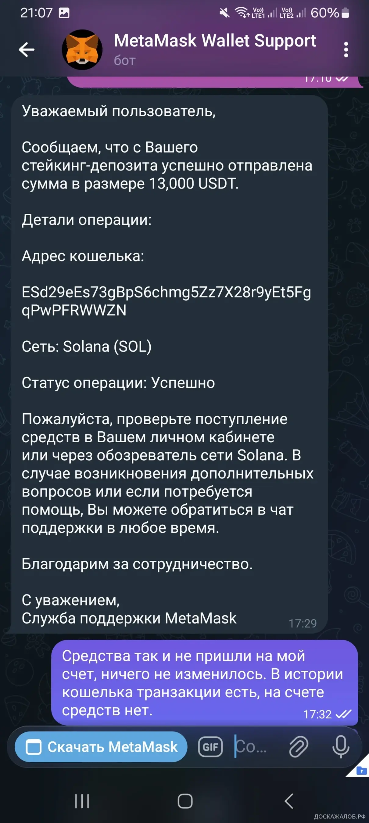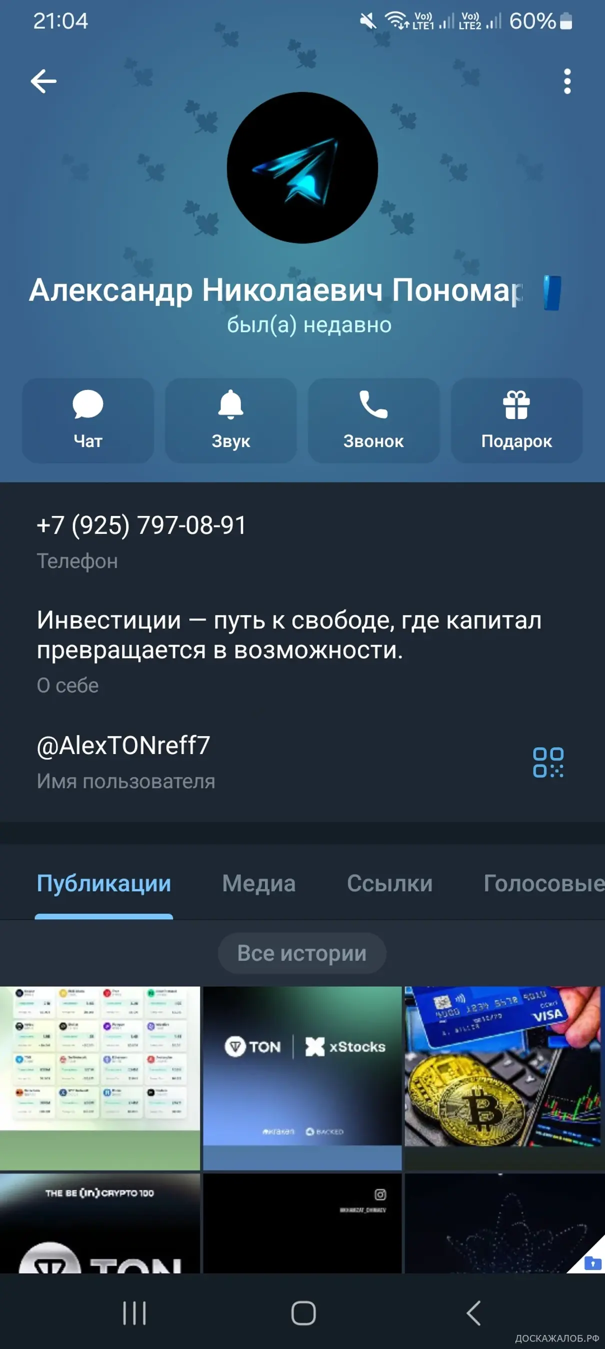 Представился Александром, общался с ним почти три месяца по инвестициям в криптовалюту. Он даже обучал меня по началу. Затем предложил разместить средства которые я завел на криптобиржу на депозит под очень хороший процент. Около 5000$. Но сделать это через телеграмм бот криптокошелько Метамаск (не официальный как оказалось). Я отправил деньги на адрес из бота, и на моем кошельке они появились. Но как выяснилось позже, это были ненастоящие USDT, а искусно сделаная обманка, токены которые ничего не стоят. Не о чем не подозревая, я довел баланс кошелька до 15000$! И когда захотел их вывести обратно, тут всё и выяснилось. Кормили меня всякими сказками про транзитные счета и что надт еще повысить баланс счета. Так же этот мошенник проводит "сделки" через монетк ТОN, в телеграмм-кошельке.