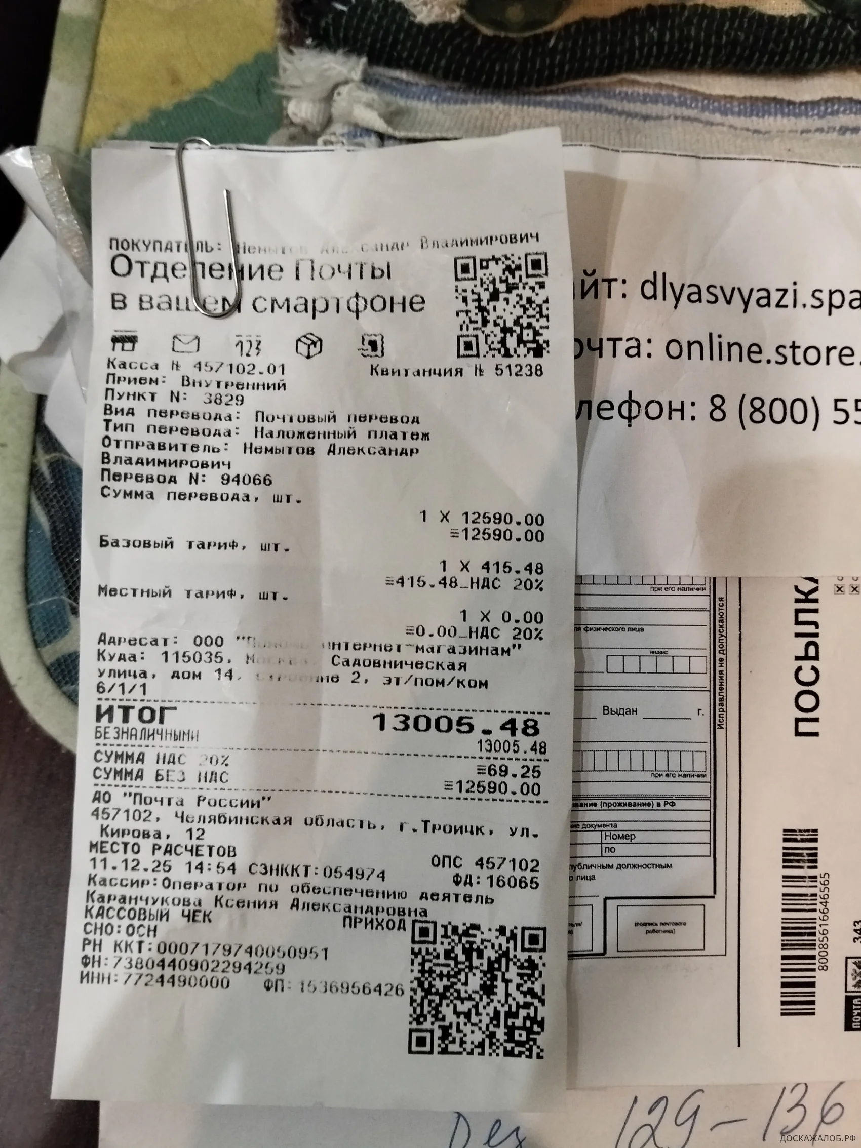 В начале декабря 2025 года я сделал заказ в интернет магазине, Сайт: dlyasvyazi.space. Почта: online. store.magazin@gmail.com Тел. гор. линии 8 (800) 5512179 зимний костюм "Поплавок" за 12590 рублей, заказ №80085616646565 (указав необходимый размер, 4хL Рост:170-176, Грудь:127-134, Тал.117-124, Бёдра:129-136 ,что соответствует 62-64размеру.) Оплатив на почте 13005,48 рублей и вскрыв посылку дома был сильно огорчён! Костюм (если можно так его назвать) был на подростка, размер на этикетке стоял 56, брюки шаровары вместо комбинезона, цвет Серый, а не чёрный, никакого тёплого белья нет, материал дешёвый! Пытался сразу дозвонится, отвечал только автоответчик: все операторы заняты, перезвоним в рабочее время, прошло уже больше месяца - Тишина! По интернету был ответ представителя магазина назывался Николай, по вам вопрос решён получите 10000 рублей. Я даже и на эту сумму был согласен, но это обман!