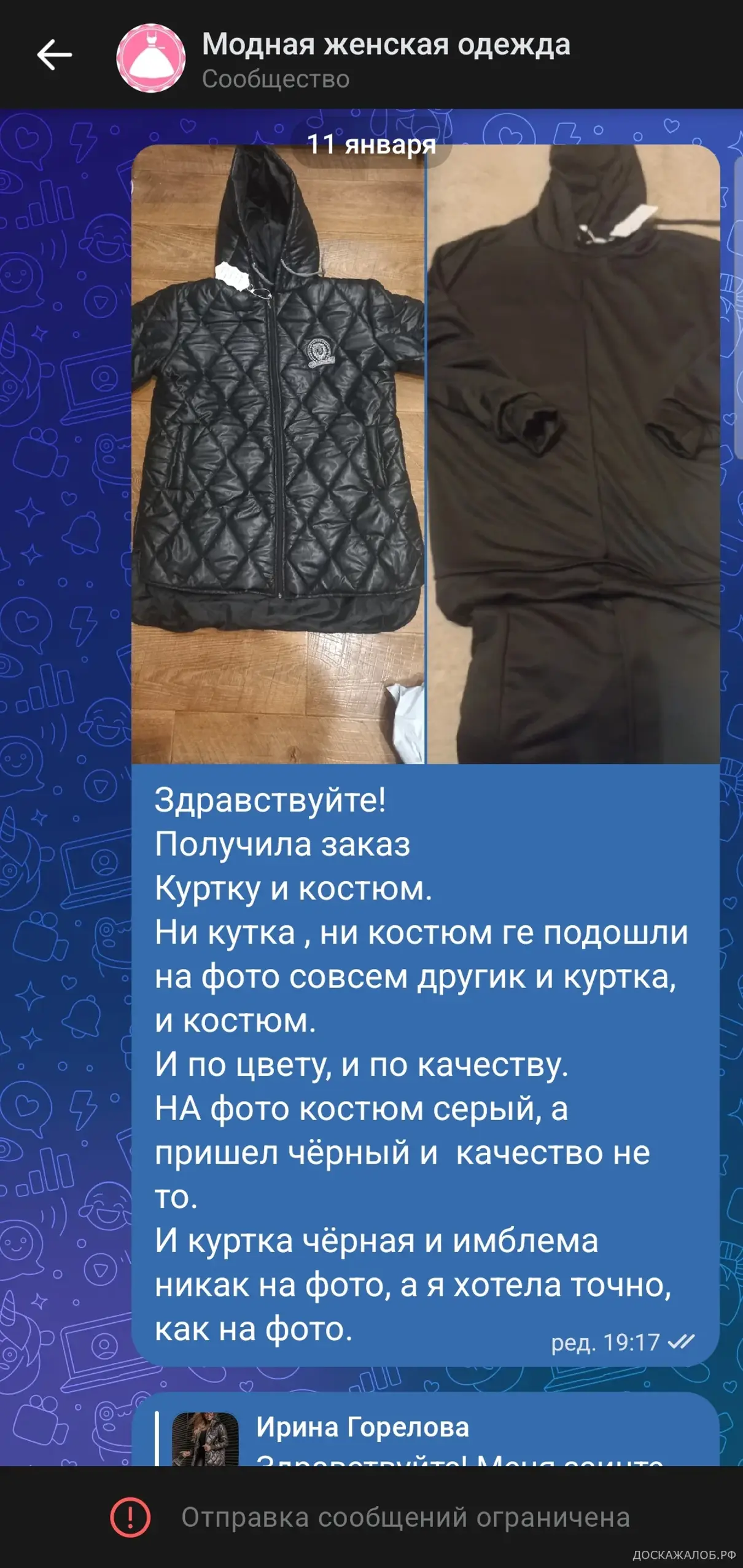 Купила в интернет-магазине «Модная женская одежда» во «ВКонтакте» куртку и костюм, но ни одна вещь не соответствует ни размеру, ни фасону, ни качеству.
