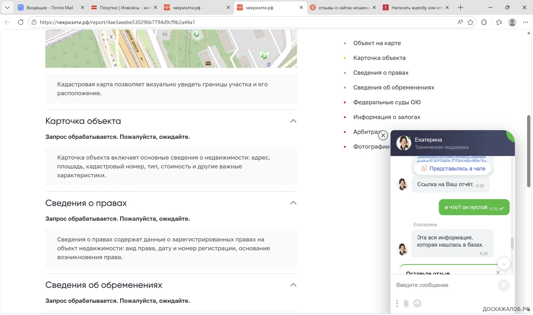 Предлагают услуги юридической проверки недвижимости. После оплаты услуг присылают ссылку на пустой отчет и сообщают, что данных на объект нет (это всё что есть в базах). В отчёте нет информации даже той, что есть в открытой базе Росреестра. Не ведитесь на обещания - это развод и потеря денег.