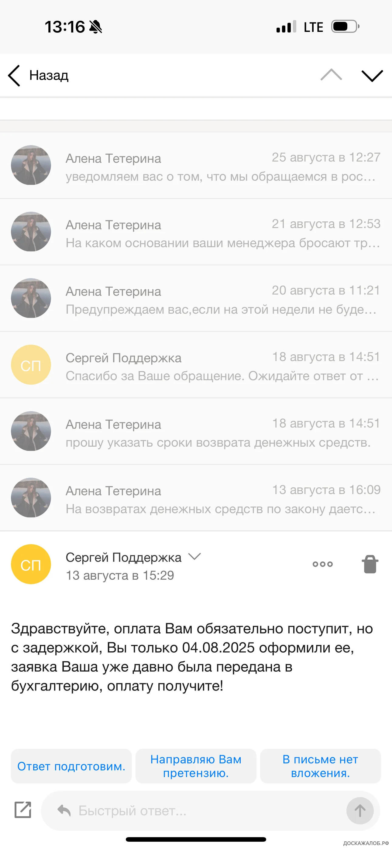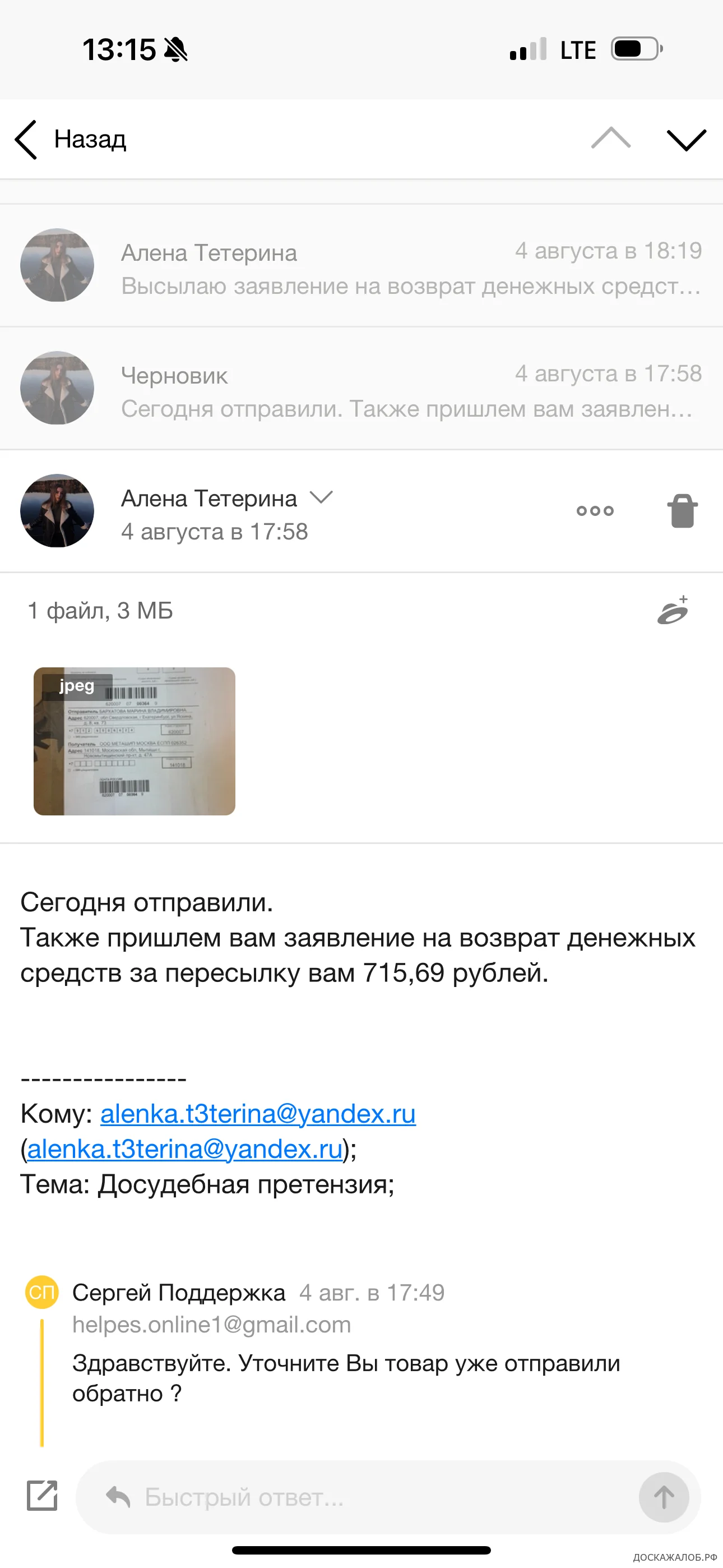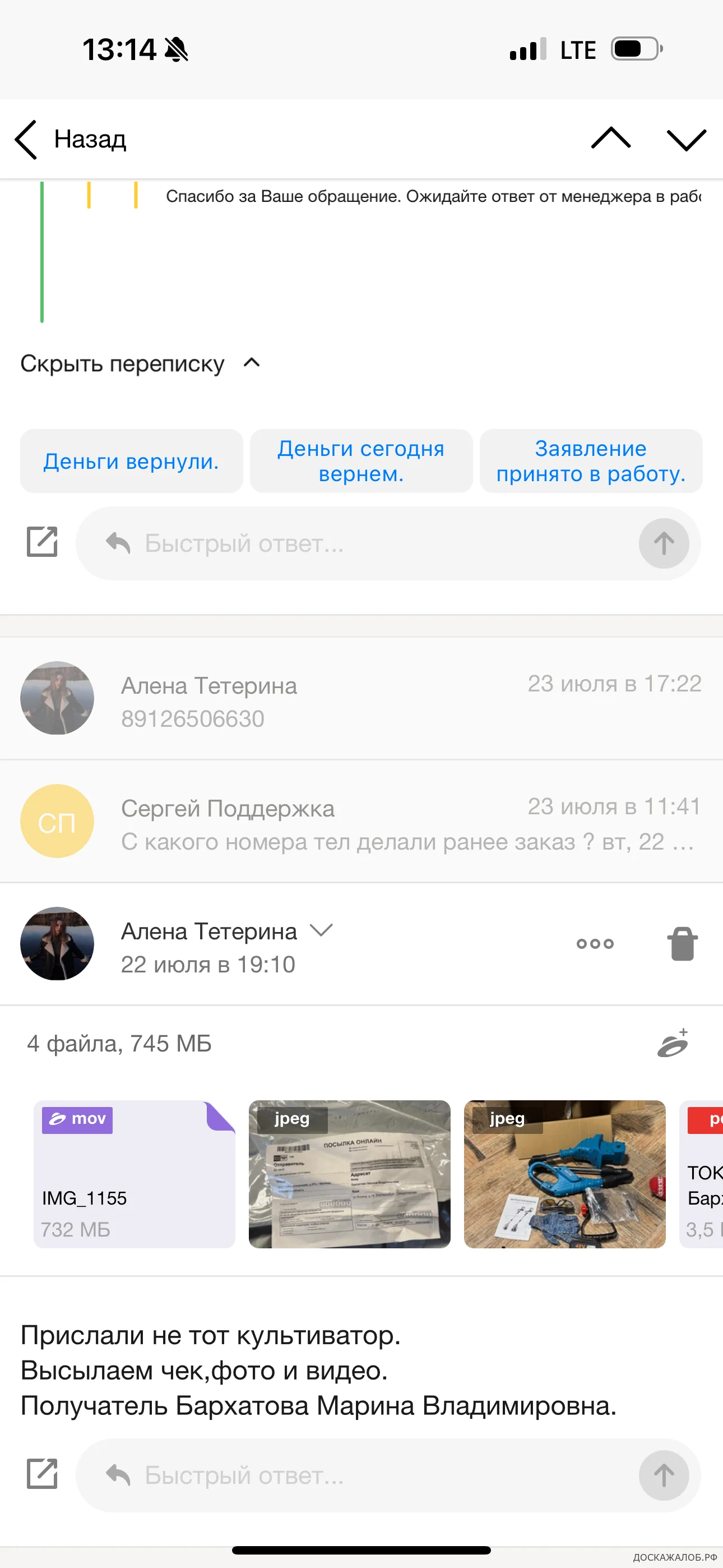 Товар пришел совершенно не тот, который я заказывала. Я связывалась с поддержкой, и мы договорились о возврате денежных средств. Заявление о возврате товара и возврате денежных средств было написано 31.07.2025, где были указаны реквизиты карты, принадлежащей мне. Также для перевода денежных средств был указан номер телефона моей дочери, по согласованию с менеджером поддержки от 04.08.2025. Я заплатила 12590 рублей за товар, 415,48 рублей за почтовые услуги и 715,69 рублей за возврат товара. Однако на свой счет оплату по указанным реквизитам я до сих пор не получила.