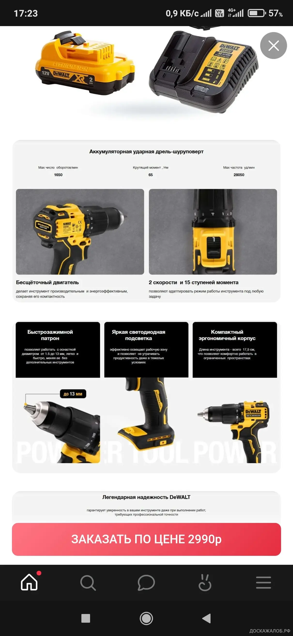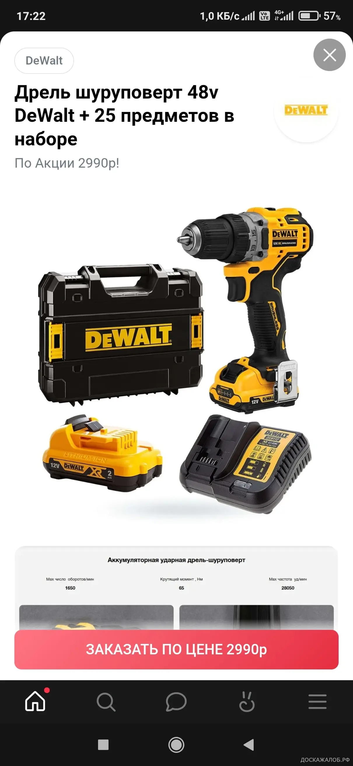В рекламе шуруповерта Dewalt было описание, цена (2999руб) и кнопка "перезвонить". Перезвонили, выяснили адрес для доставки. Через две недели пришла посылка наложенным платежом. Но присланный шуруповёрт не соответствовал рекламе (такой на Озон стоит 1000руб). От получения отказался. Теперь с разных телефонов и смс достают с угрозами подать в суд.