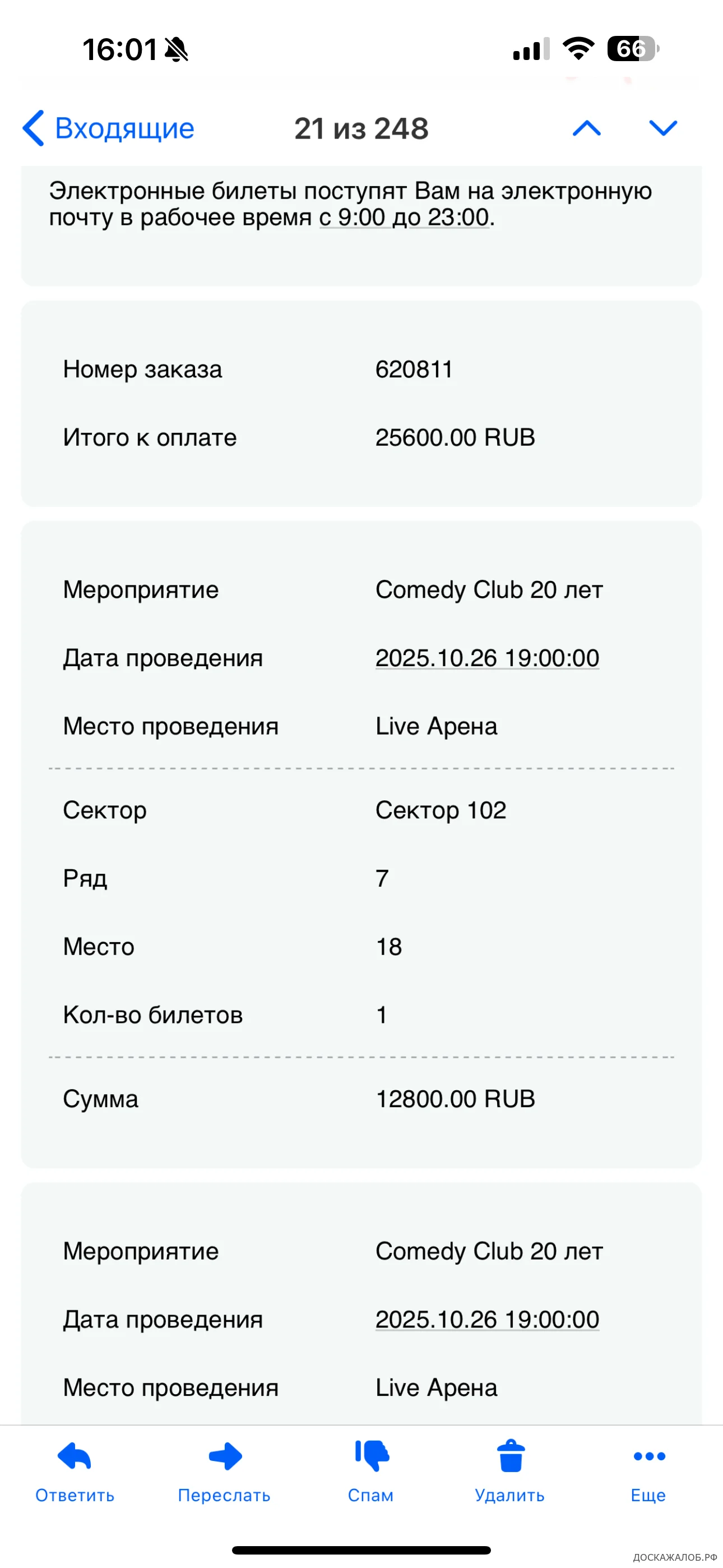 Приобрела билеты на концерт Комеди-клаб, сами билеты не прислали. Дозвониться невозможно. Номер заказа 620811, просьба вернуть деньги чтобы не обращаться в полицию и в суд.