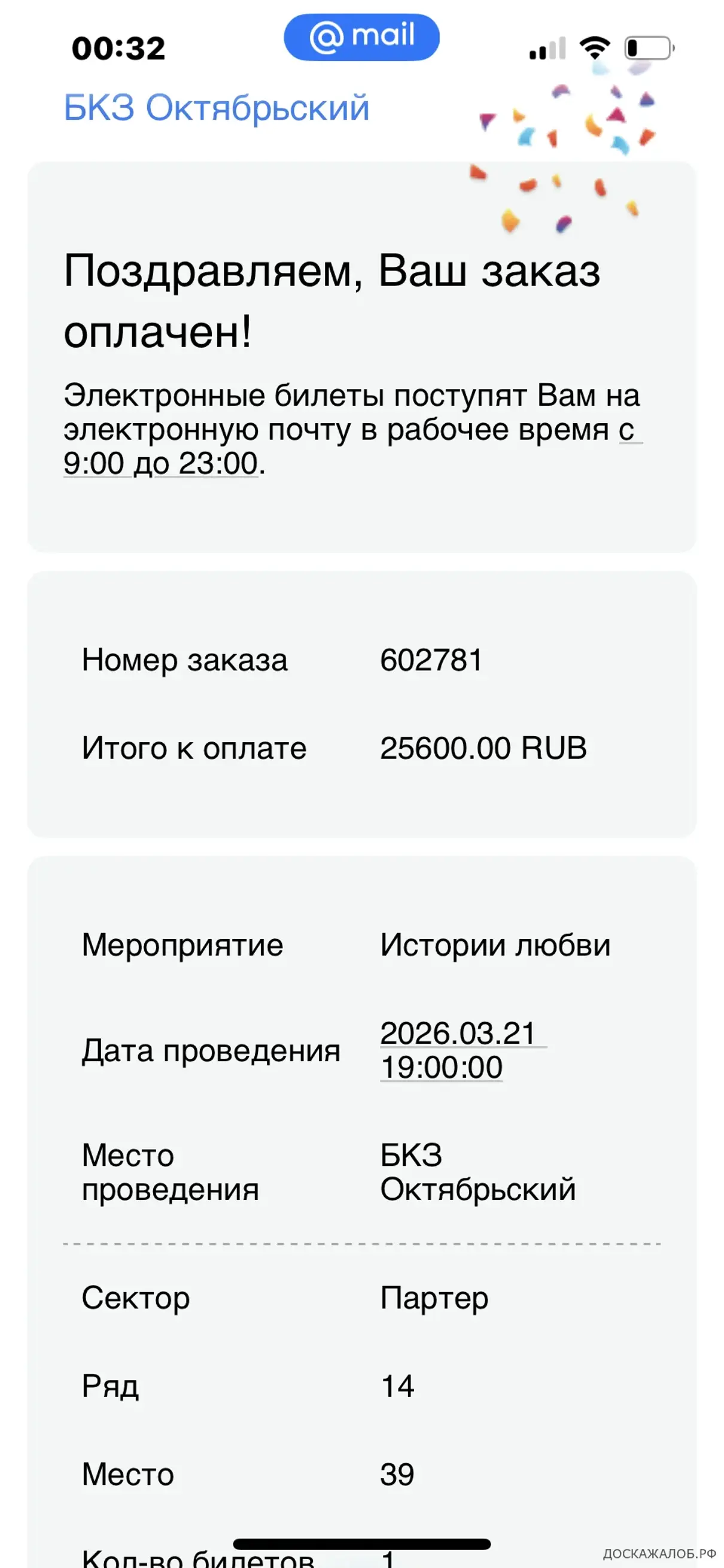 Купила билеты на концерт в марте в БКЗ, решила, что видимо обновили сайт и теперь он выглядит по другому. Прочитав сообщение на почте о том, что билеты электронные пришлю в рабочие дни, насторожилась ещё больше, всегда билеты приходили сразу же. В результате стала смотреть внимательнее и нашла настоящий сайт. Места которые я выкупила 10 минут назад оказались свободны и цена на них на 4 тысячи 800 рулей ниже. Разница 9 тысяч. Верните деньги, имейте совесть!!!