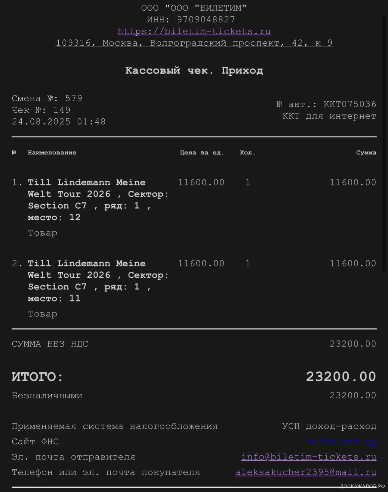 Купила билеты мне и маме 24 августа 2025г на концерт Rammstein в город Алматы (Казахстан) 6 января 2026г, стоимость двух билетов вышла 23200₽!!!