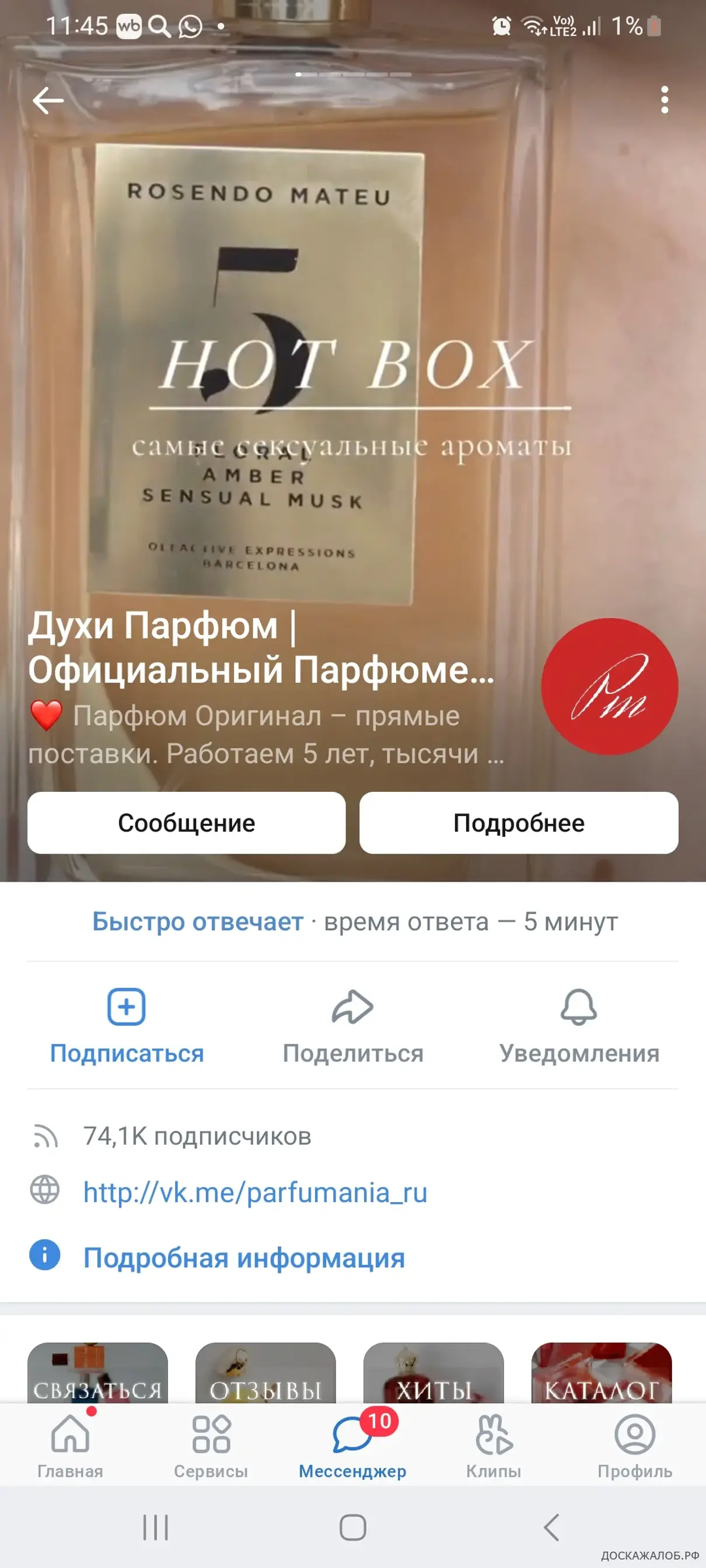 В вк есть сайт с продажей парфюмерии, таких сайтов много, утверждают что оригинал, купила, пришли дёшевая подделка с браком, ничего не соответствует качество отвратительное, все в сколах в царапинах, нет бач кода всё ив потертастях отправила фото менеджеру, потребовала вернуть деньги, тишина Семен Памалин и его менеджеры мошенники, таких надо привлекать