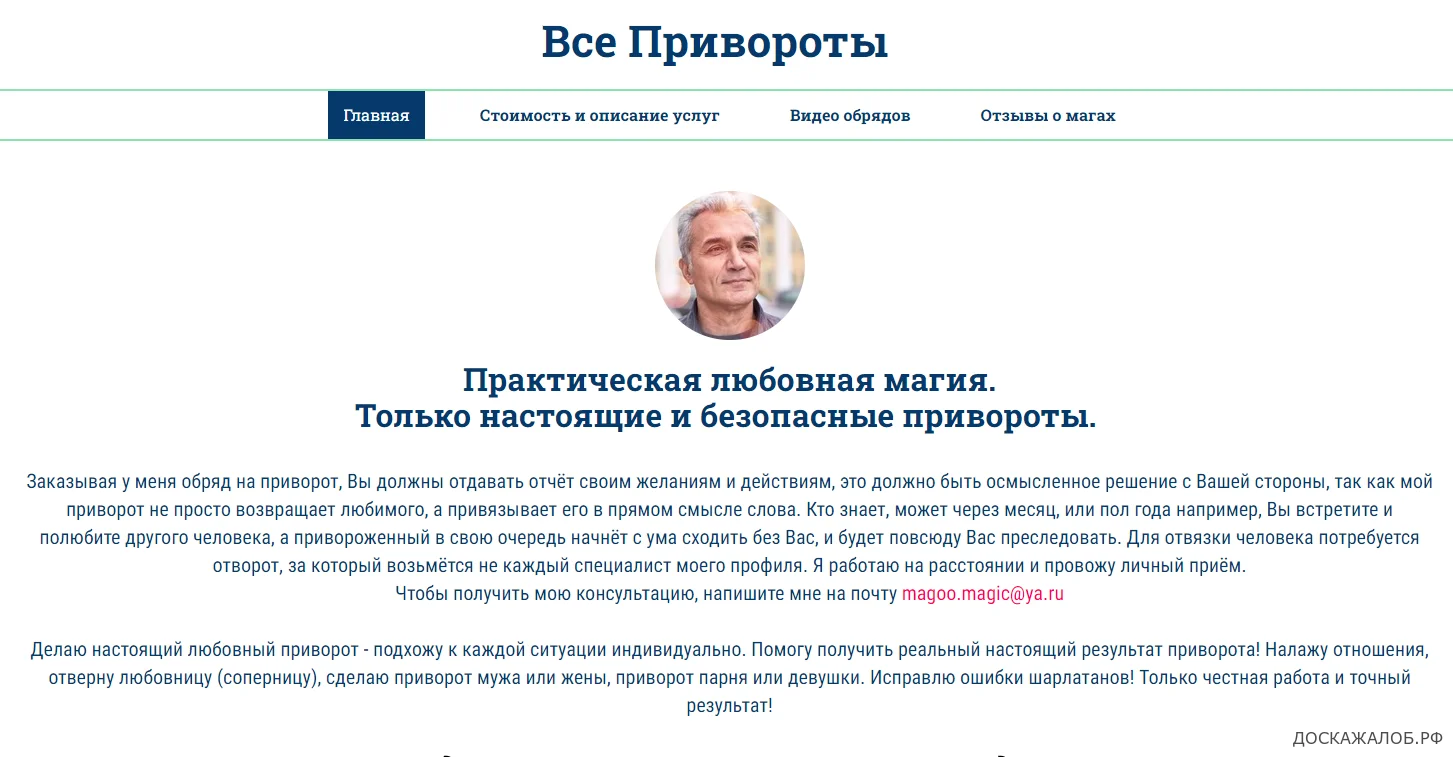 Ни в коем случае не рекомендую сайт vseprivoroti.com! Если вы находитесь в трудной жизненной ситуации, ищите реальную помощь, а не сомнительные "магические" услуги, которые, скорее всего, окажутся лишь дорогостоящим разводом.