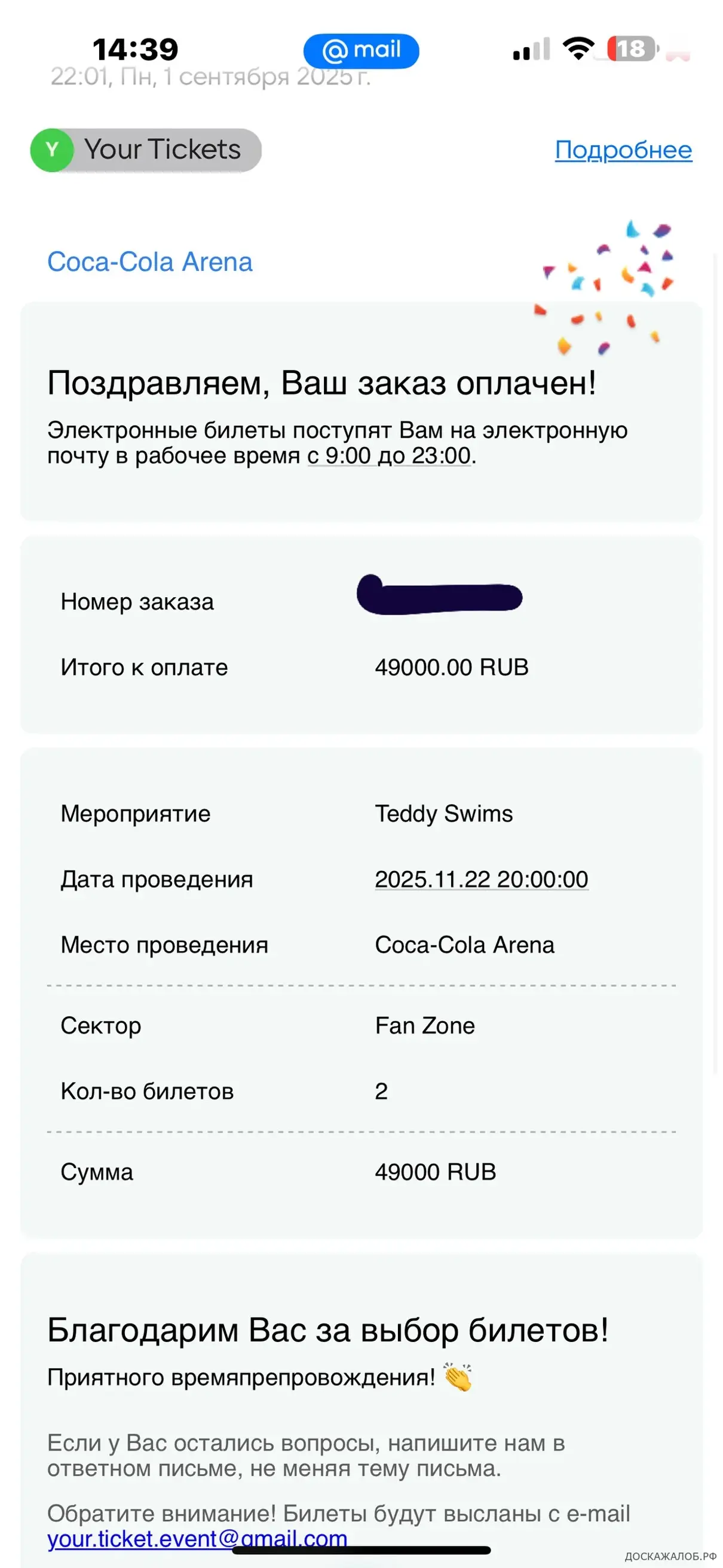 Оплатила билеты 1 сентября на концерт Тедди Свимс в Дубае на площадке Coca Cola Arena. Билеты не пришли. На почте указан телефон +7 906 186-00-08 , с него ни кто не отвечает. Я знаю, что я не одна пострадавшая (почему так долго этот фейковый сайт продолжает выходить один из первых.
