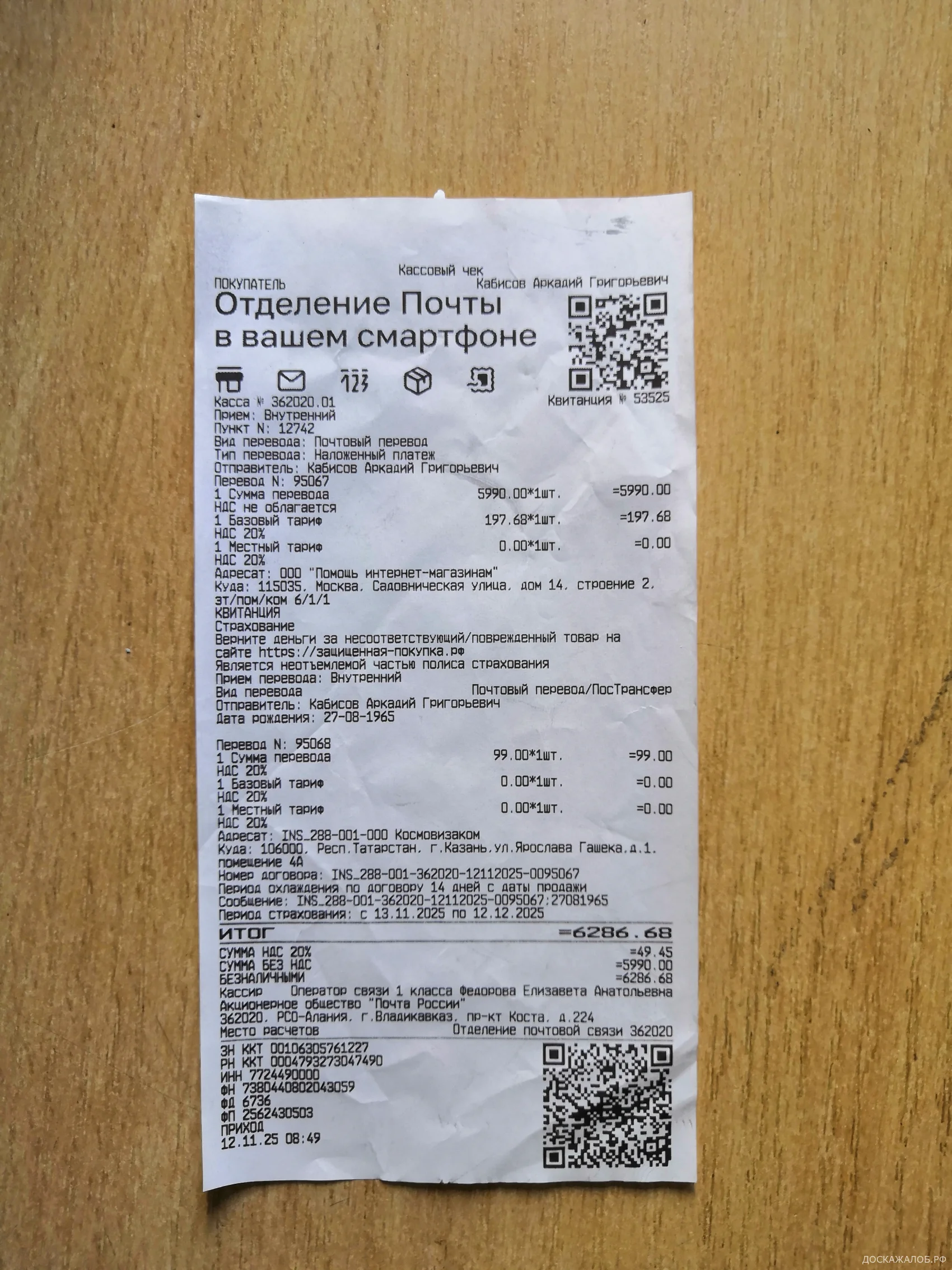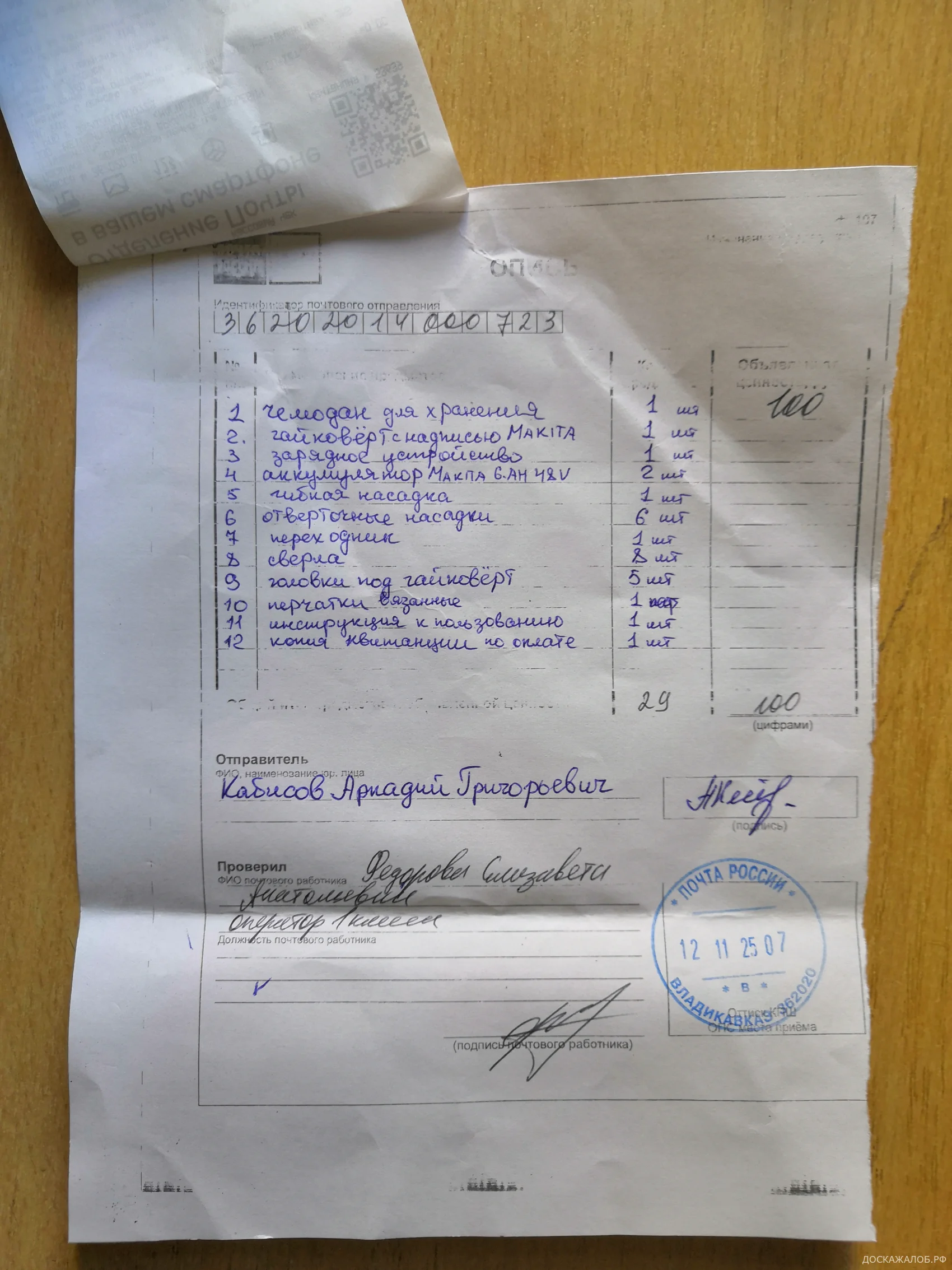 Прислали китайскую подделку гайковерта, некачественный товар с кейсом. Возврат в тот же день почтой России с описью с квитанцией по оплате. Не возвращают мне деньги.