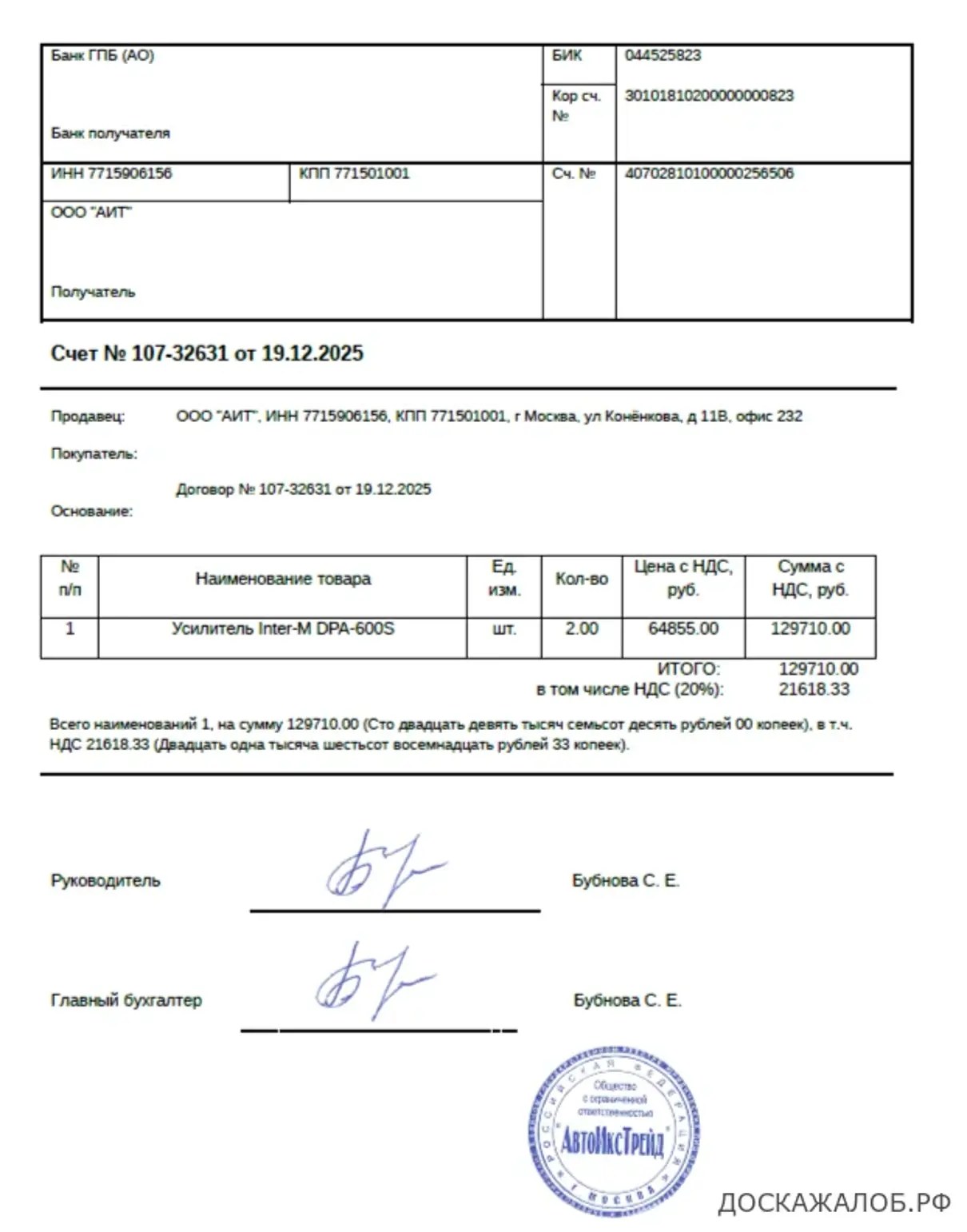Юридическое лицо ОБЩЕСТВО С ОГРАНИЧЕННОЙ ОТВЕТСТВЕННОСТЬЮ "АВТОИКСТРЕЙД" (ООО "АИТ") ИНН 7715906156, директор Бубнова Светлана Евгеньевна. Именно на эту компанию оформили договор поставки и счет на оплату. БУДЬТЕ БДИТЕЛЬНЫ!
