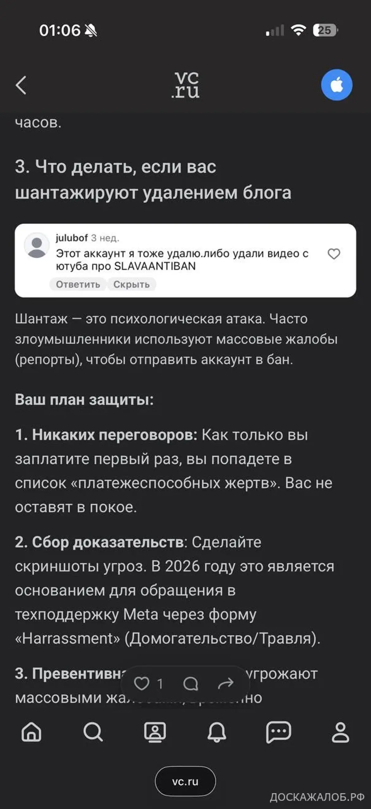 Slavaantiban — это худший опыт сервиса, который у меня был за долгое время. Оплатила «разблокировку» Instagram: до оплаты рассказывали, что помогут за две недели. Прошёл месяц — результата ноль. Никаких внятных подтверждений, что вообще что-то делалось: ни нормального отчёта, ни доказательств обращений, ни понятного статуса - только мутные ответы и вечные отговорки. Деньги по сути просто слились в унитаз: на выходе пустота, а «результат не гарантируем». Отдельный “бонус” - хамство и тон, будто это я им что-то должна, а не они взяли деньги за услугу. По интернету есть публичные материалы и скриншоты переписки, где вместо адекватной работы и ответственности фигурируют угрозы и давление на недовольных клиентов за плохие отзывы. Если вам дороги деньги, время и нервы - обходите стороной. Здесь вы покупаете не разблокировку, а раздражение, пустые обещания и отсутствие каких-либо гарантий или прозрачности.