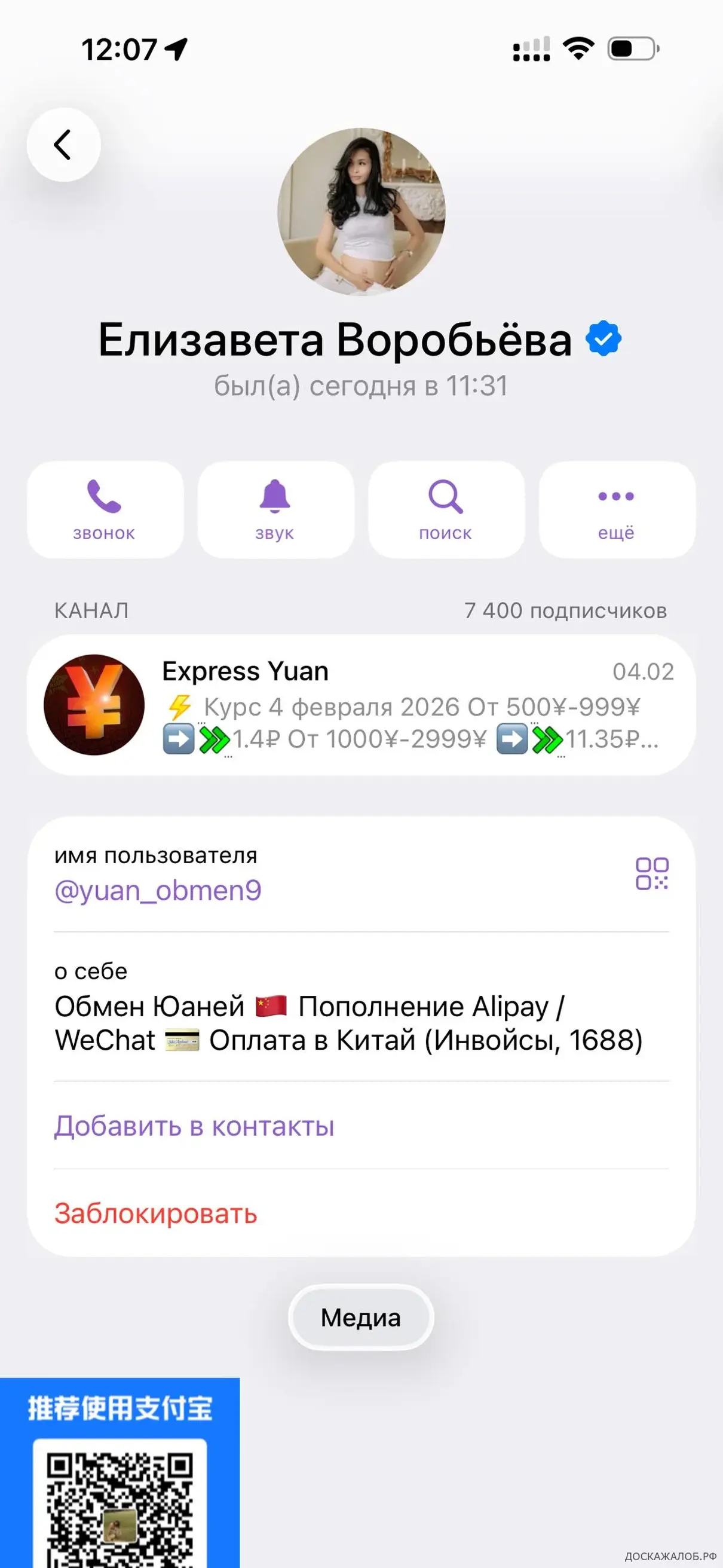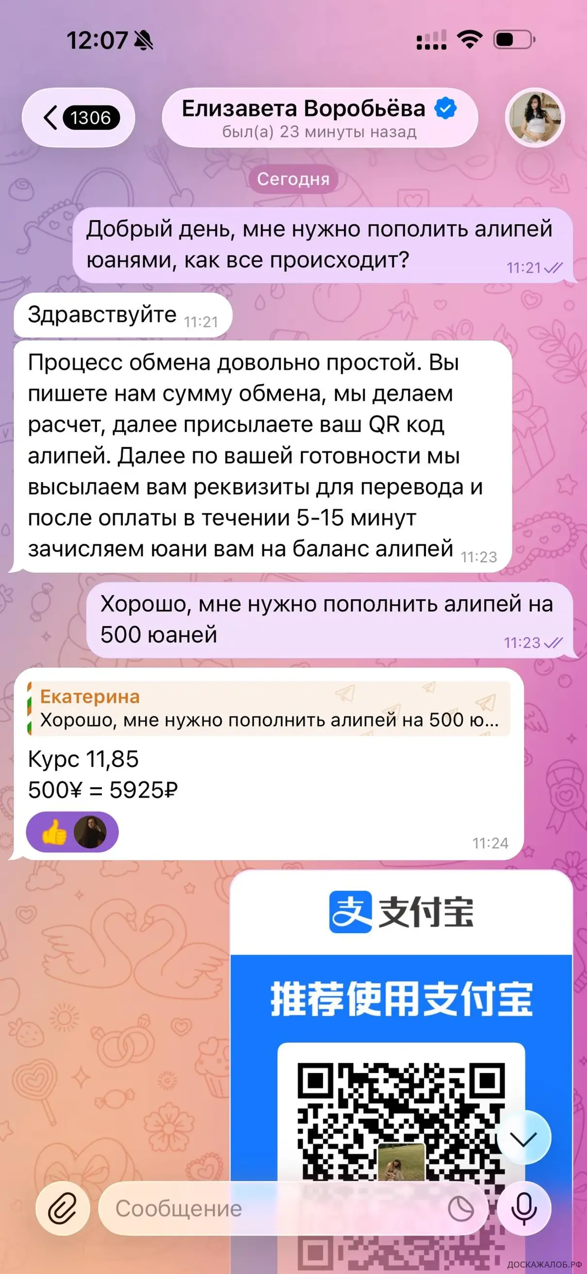 В мессенджере Телеграмм был найден канал под названием "Express Yuan", существующий с 2024 года, в котором предлагались услуги обмена рублей на юани и пополнением кошелька Alipay.