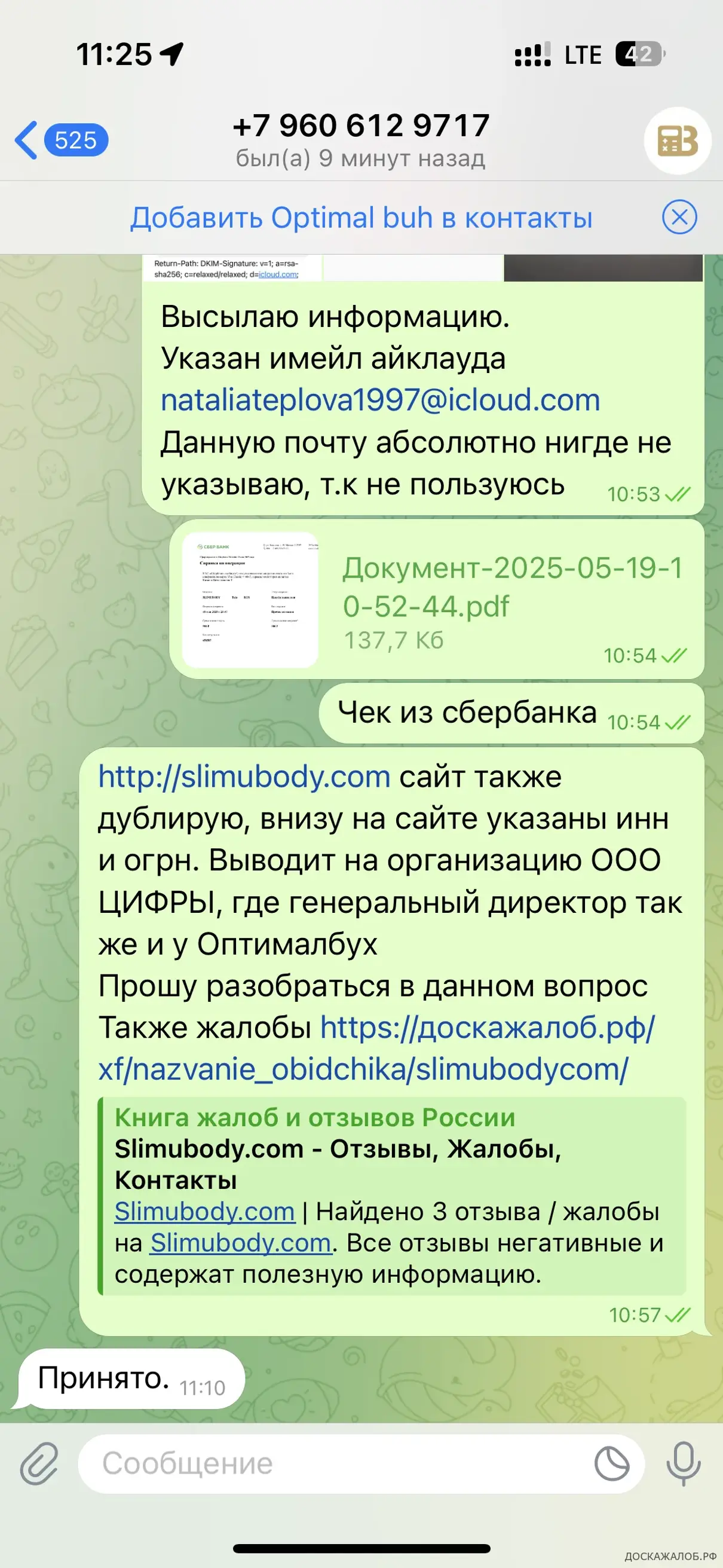 По инн пробила вторую организацию оптималбух, позвонила туда и только после звонка подтвердили свое отношение к организации ооо цифра. Во вложении прилагаю все скриншоты по перепискам. Написала также в банк на возврат средств. Мошенникам пригрозила заявлением в полицию, на Ген. Дира и организации.