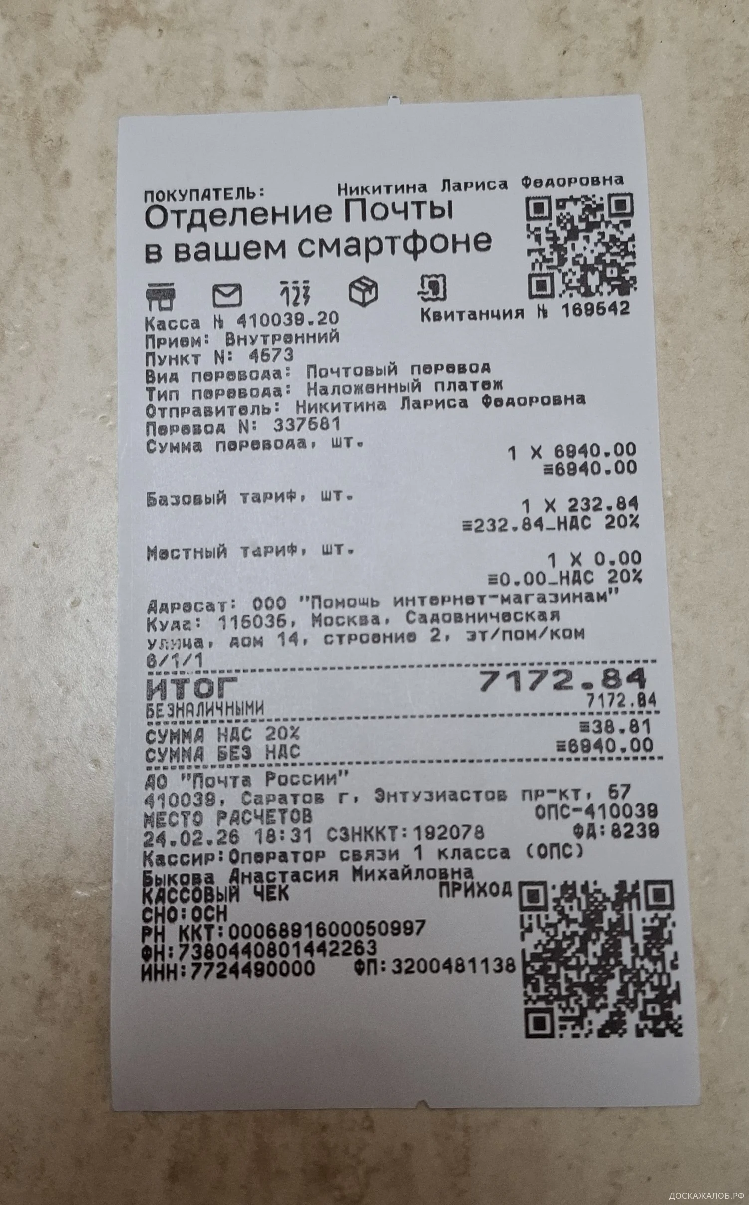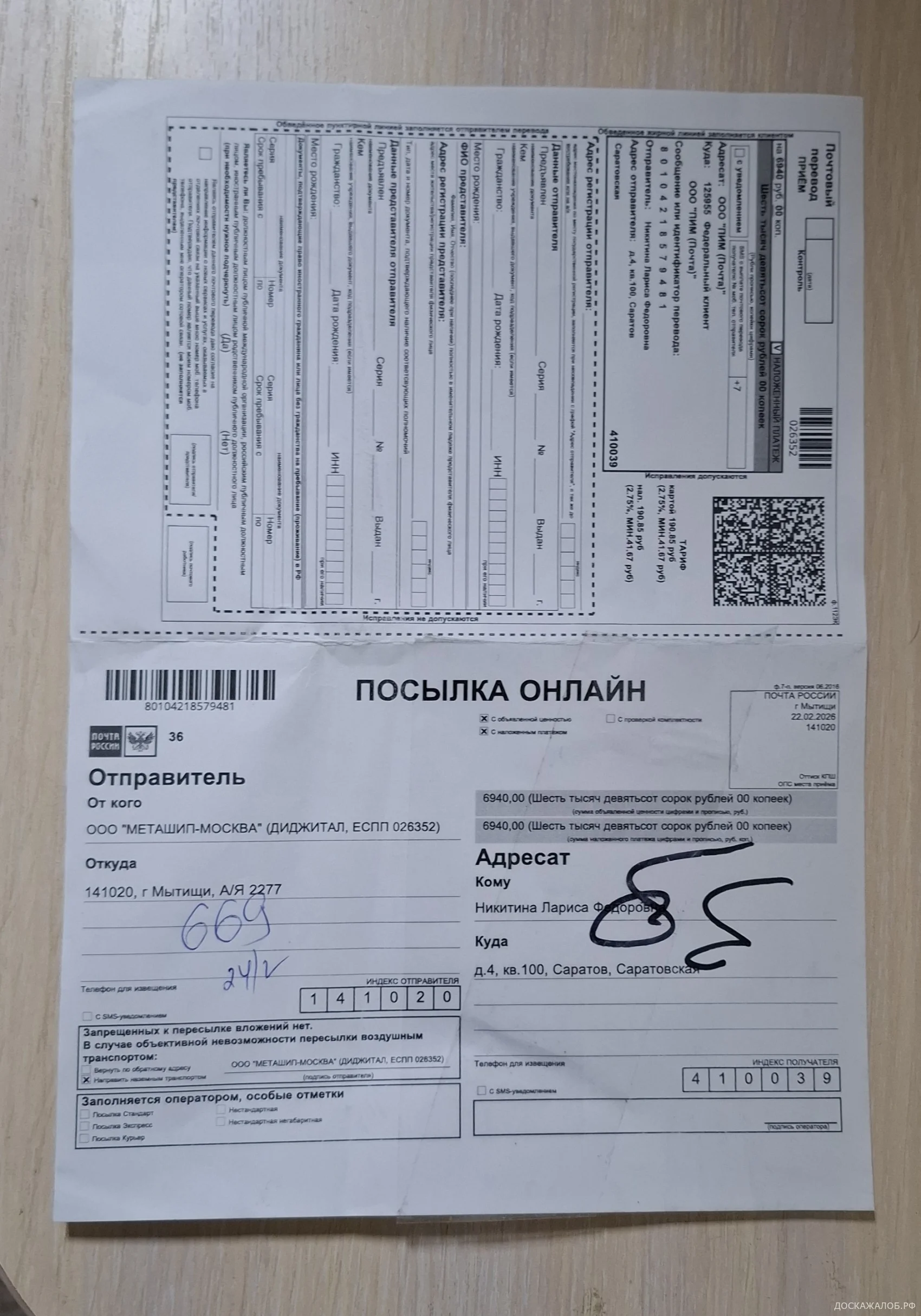 24 февраля 2026 года я получила посылку стоимостью 7172,84 (семь тысяч сто семьдесят два рубля, 84 копейки). Идентификатор перевода (трек-номер) 80104218579481. Отправитель: ООО «МЕТАШИП-МОСКВА» (Диджитал, ЕСПП 026352), Адрес: 141020, г Мытищи, а/я 2277.
