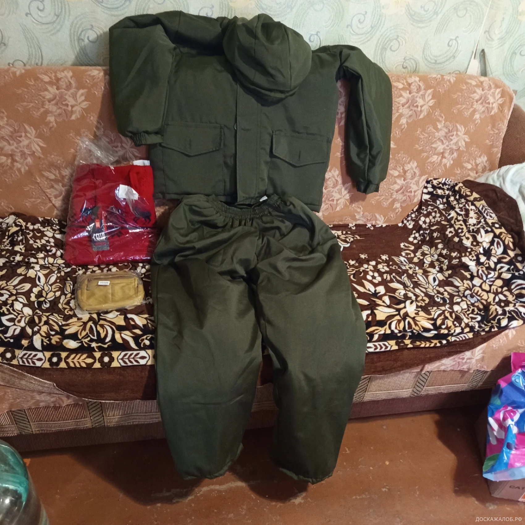 9 января посылка (трек-номер 80080517058257) поступила в отделение Почты России. Там мне сообщили, что необходимо оплатить сумму 10 990 рублей, а проверить вложение можно только после оплаты. Я оплатил заказ и дома распаковал посылку. В итоге выяснилось, что товар не соответствует заказу: вместо костюма пришли зелёные кофта и штаны, вместо турецкого термобелья — красный свитер и бежевая сумочка. Размер вложенных вещей — 56–58.