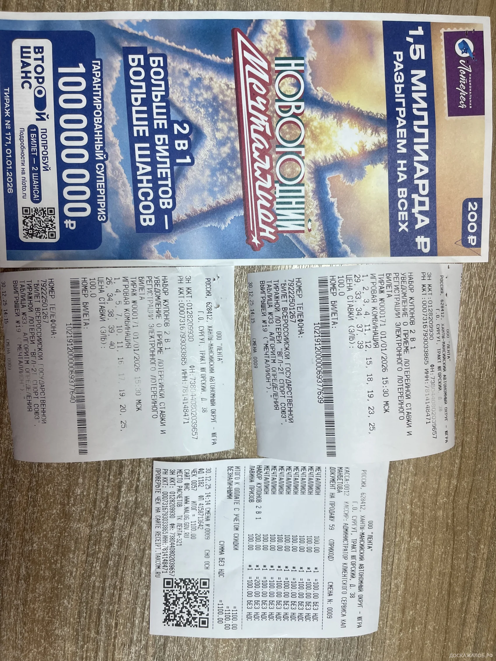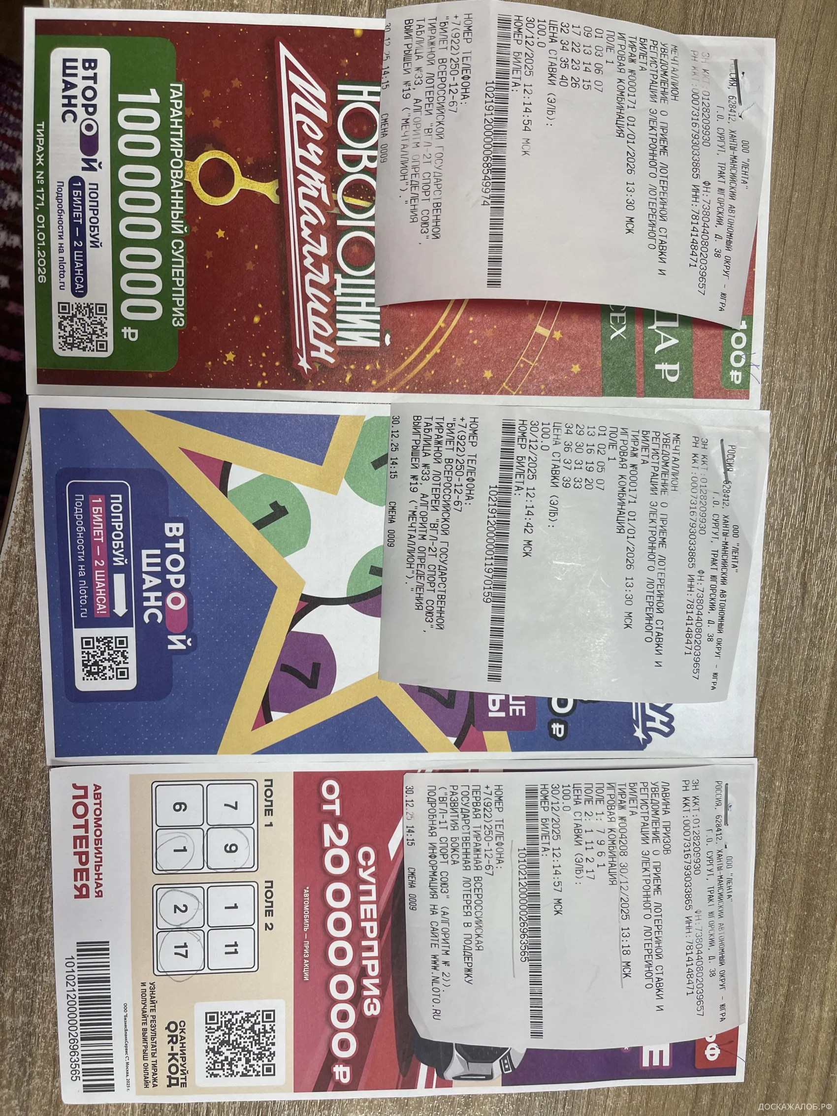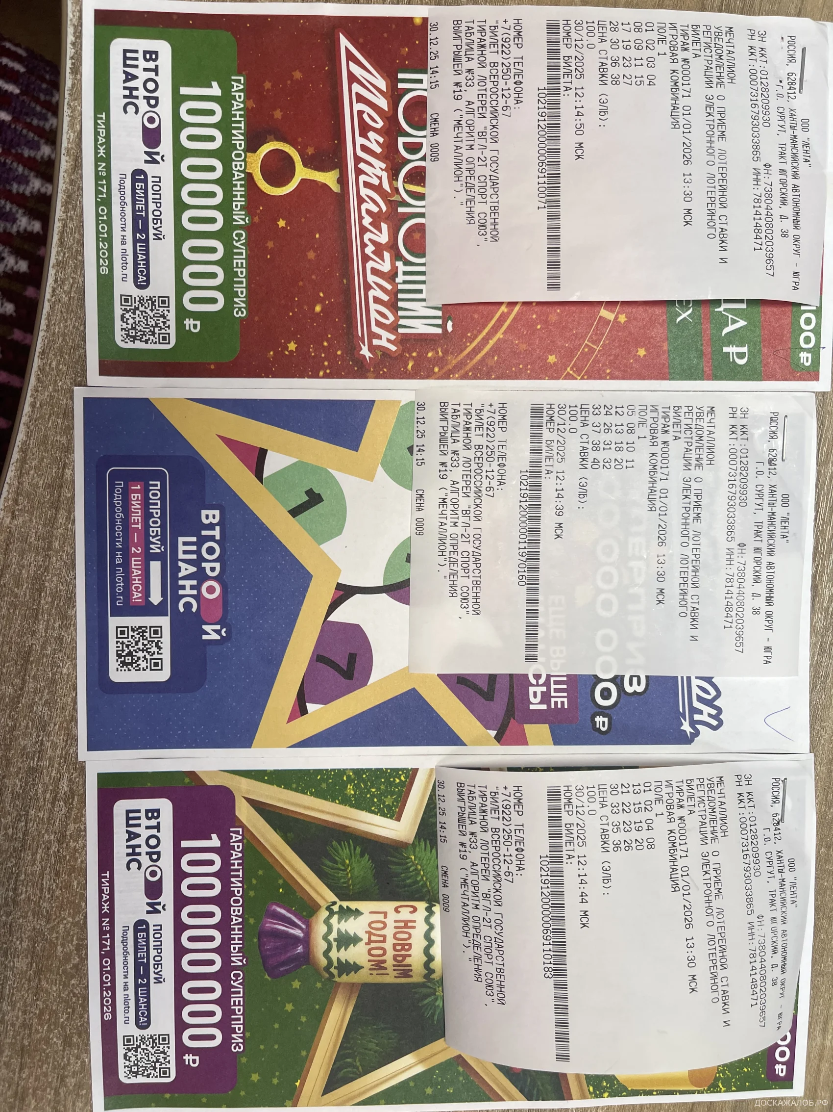 30 2025 г. декабря в городе Сургуте - магазин Лента на кассе я приобрела десять лотерейных билетов "Национальной Лотереи" (Мечталлион, Новогодний мечталлион, Автомобильная лотерея). Захотелось поучаствовать, испытать судьбу. Пять лотерейных билетов выиграли, но когда я стала на официальном сайте Национальной лотереи nloto.ru проверять свои билеты мне ИИ отвечал: " Что такие номера в розыгрыше не участвовали, так как эти билеты не прошли регистрацию вообще" Это как понимать? Покупаешь билеты у официального распространителя, а они недействительны? Это наглый сбор денег с людей! Попыталась разобраться: отправила копии билетов и чеков на сайт, через 13 дней пришел ответ: На мой бонусный счет зачислили 200 бонусов для приобретения следующих лотерейных билетов. - интересно, а где мой бонусный счет, и где получить мой выигрыш который уже существует? Возмутительно! Вроде бы, как мне казалось, серьезная организация, а распространяет (продает) просто пустые бумажки ничем не защищенные (Филькина грамота)! Мне почему то кажется, что ни я одна оказалась обманутой "Национальной лотереей"...