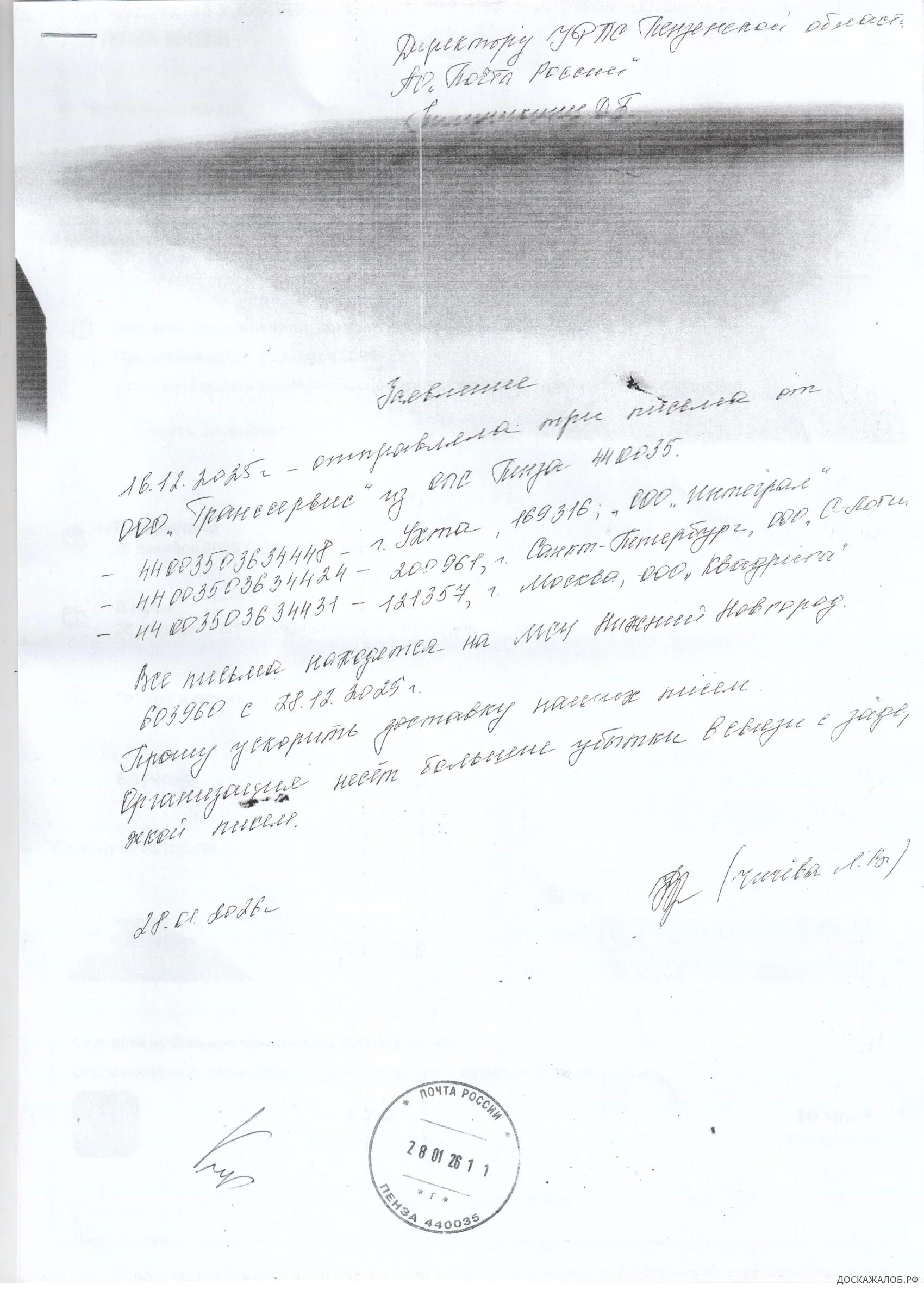 16.12.2025 были отправлены 3 письма почтой России из г. Пензы, отделение 440035. Письма утеряны в сортировочном пункте. Заявление на розыск было подано 27.01.2026. До сих пор не получен ответ. Заявление прилагается.