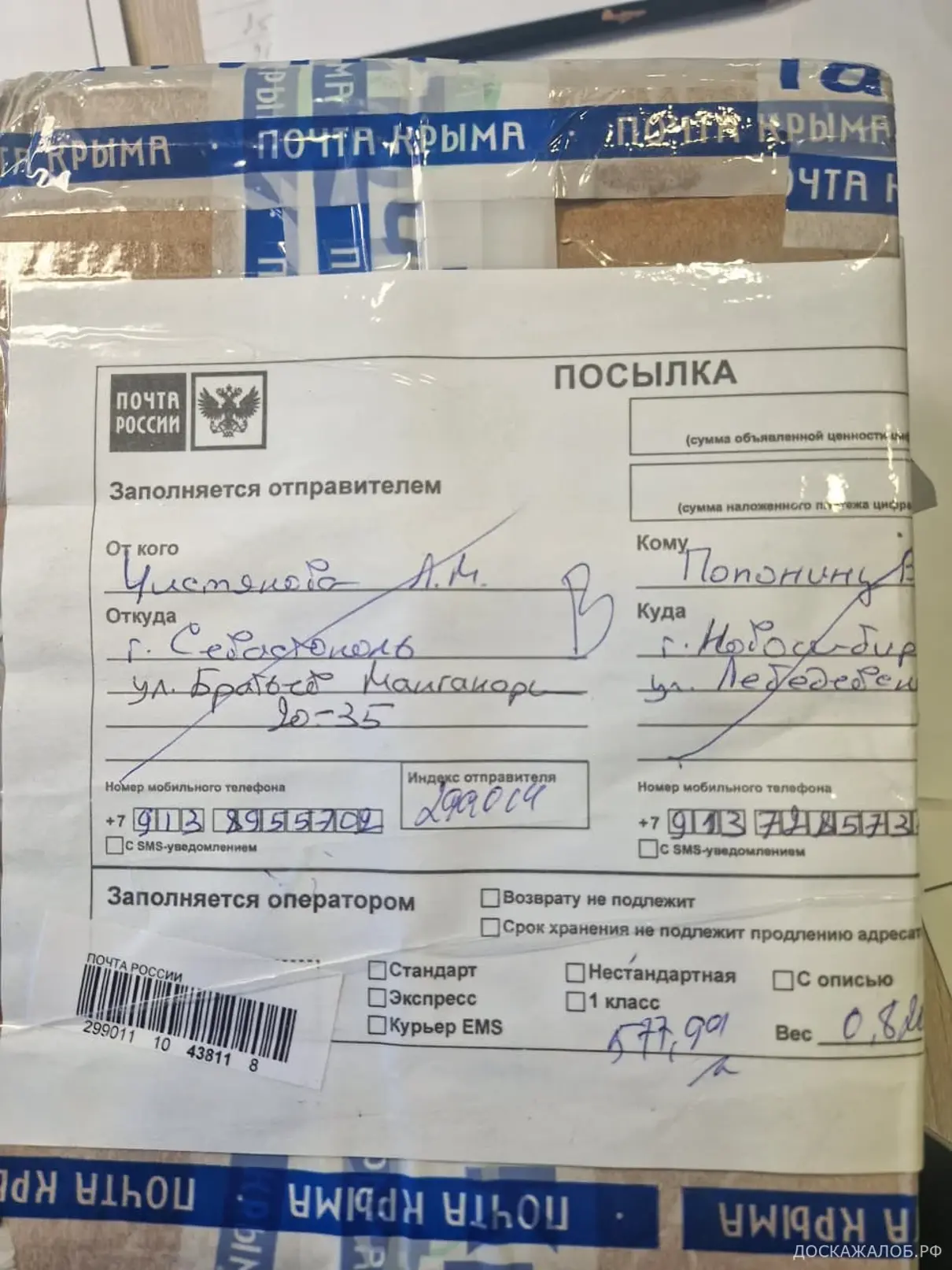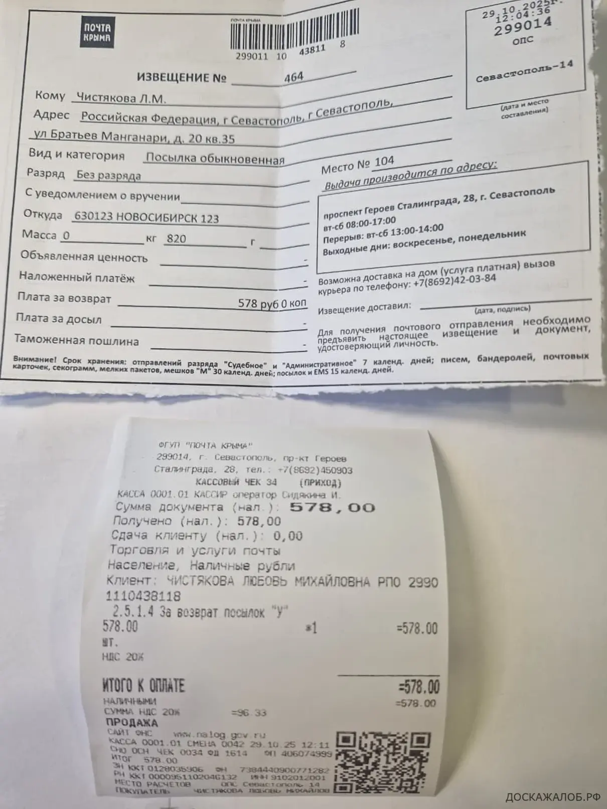 3 месяца назад из Севастополя (ул. Б. Морская) я направила родному брату в г. Новосибирск 630123 ул. Лебедевского д.2, кв. 36 посылку из 6 лечебных кремов (у него неизлечимая болезнь- ревматоидный артрит и Крымские мази ему жизненнеобходимы). № 299011 10 43811 8- Чек об отправки не сохранился. Мною собственноручно был заполен формуляр с указанием телефонов моего и моего брата. Также я известила брата, что к нему идет посылка. Он неоднократно ходил в почтовое отделение № 123, где ему отвечали, что посылки дня него нет. Его почтовый ящик на замке, подъезд тоже на замке, хулиганов и потрошителей в подъезде нет. Сегодня 29 октября мне на телефон поступил звонок, что моя посылка вернулась в Севастополь, и мне ее нужно забрать да еще и заплатить 578 рублей. Т.о. за услуги почти Росси я заплатила 1200 рублей, а результата "0". Повторяю еще раз-ИЗВЕЩЕНИЕ в почтовый ящик никто не вложил, толи дом напутали, то ли квартиру. Брат каждый день открывал почтовый ящик, т.к очень ждал эти мази. Убедительно прошу: 1.Разобраться с нерадивыми сотрудниками 123 почтового отделения г. Новосибирска. 2. Отправить еще раз мою посылку брату за их счет. 3.Компенсировать мои расходы за возврат посылки в размере 578 рублей (фотография чека прилагается)