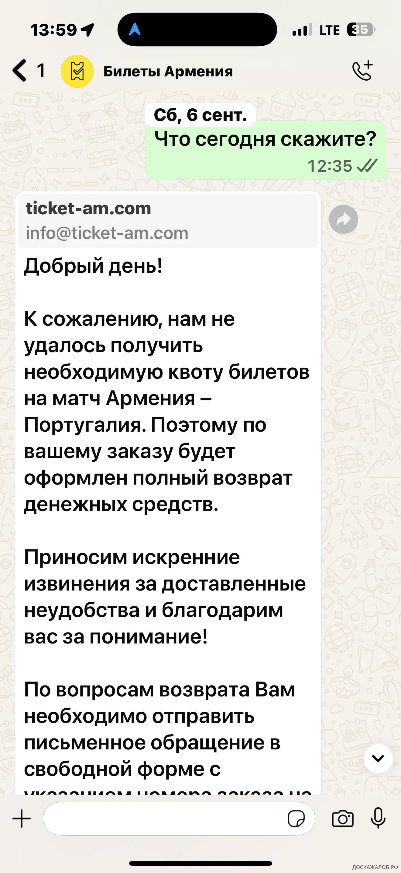 Очень подвели. Обратился в апреле за билетами на футбольный матч в Армении, приобрел заранее 5 билетов, оплатил. Уточнил, могут ли быть проблемы с билетами на матч, они уверили меня в том, что это исключено. Билетов много, и места дадут за 48 часов. Мы приобрели авиабилеты, гостиницу оплатили.